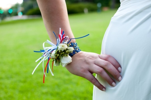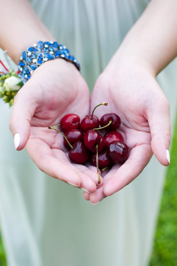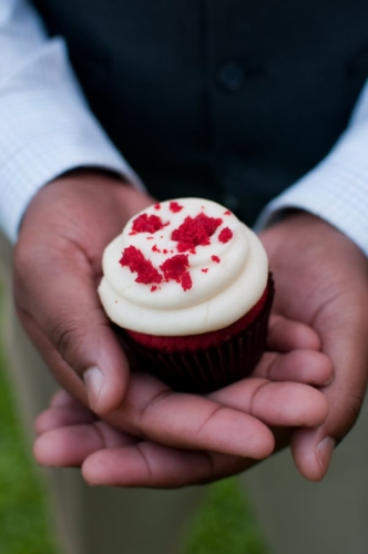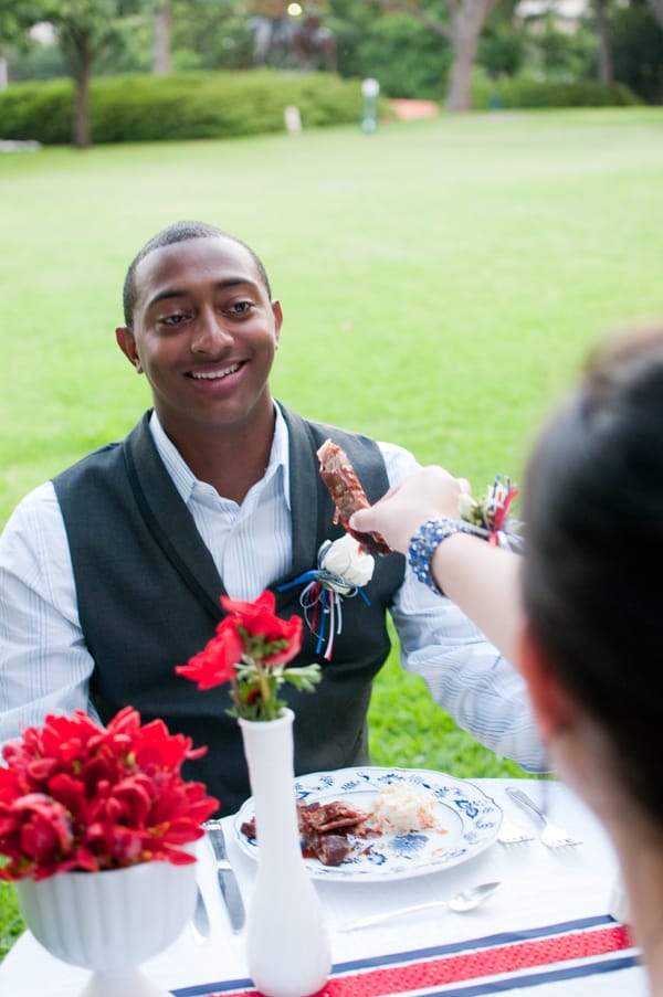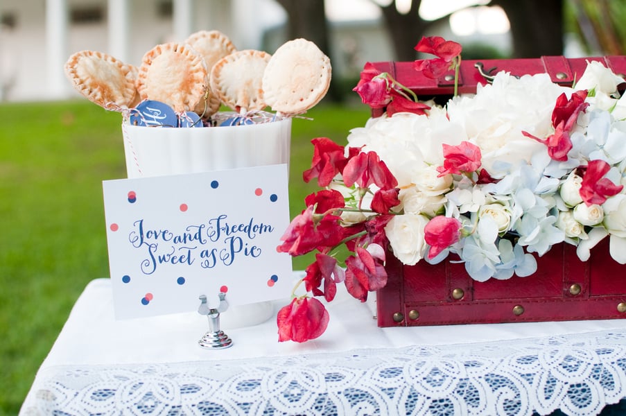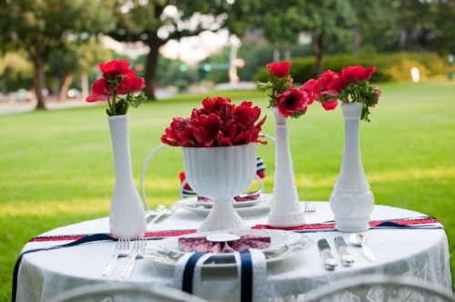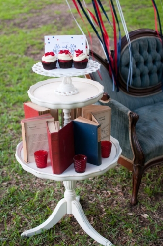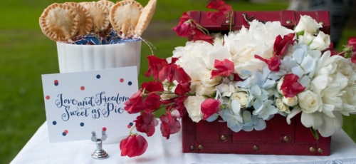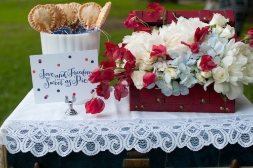 “Since this shoot has a 4th of July theme, we felt that pie was the perfect substitute for a traditional cake, especially since this is an elopement and it’s just the bride and groom. Red Velvet Cupcakes, provided the perfect pop of patriotic red. Red Sole Events created a 4th of July inspired boutonniere and corsage in lieu of a bouquet, as well as simple red florals – anemones and parrot tulips in milk glass.