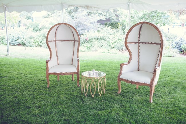 “When I was looking for the white dining chairs, I met this fabulous woman who has a warehouse of furniture that you can rent for events (Eclectic Hive). She had these amazing dome chairs and a bed swing that I loved! It looked like the bed was magically hanging from the tent ceiling, but in reality, the base of the bed reflected the grass below with paneled mirrors. I really wanted a place for our guests to sit and chat once dinner was over, if they did not feel like dancing, so we added the floating bed and the dome chairs. I placed the dome chairs and bed swing at the end of the tent close to the coffee table which was the perfect location for those who wanted to step away from the dance floor, but it also added to the garden party feel that I was going for all along.”