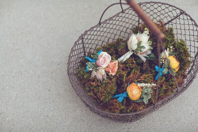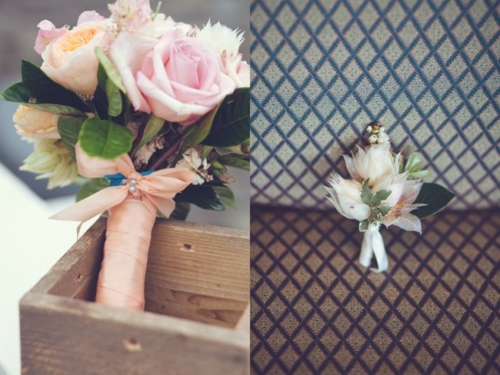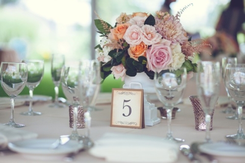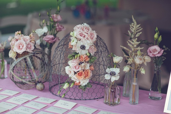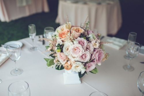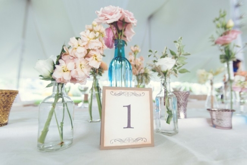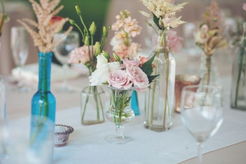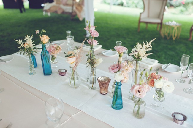 “I used peach color linens that complemented the flowers but did not overshadow the gorgeous floral spreads from the Perfect Petal. Then, we added assortments of turquoise glass bottles with other little vases to evoke the ‘French garden’ look with a simple assortment of flowers along with larger vases of flowers to also give each table a different look.”