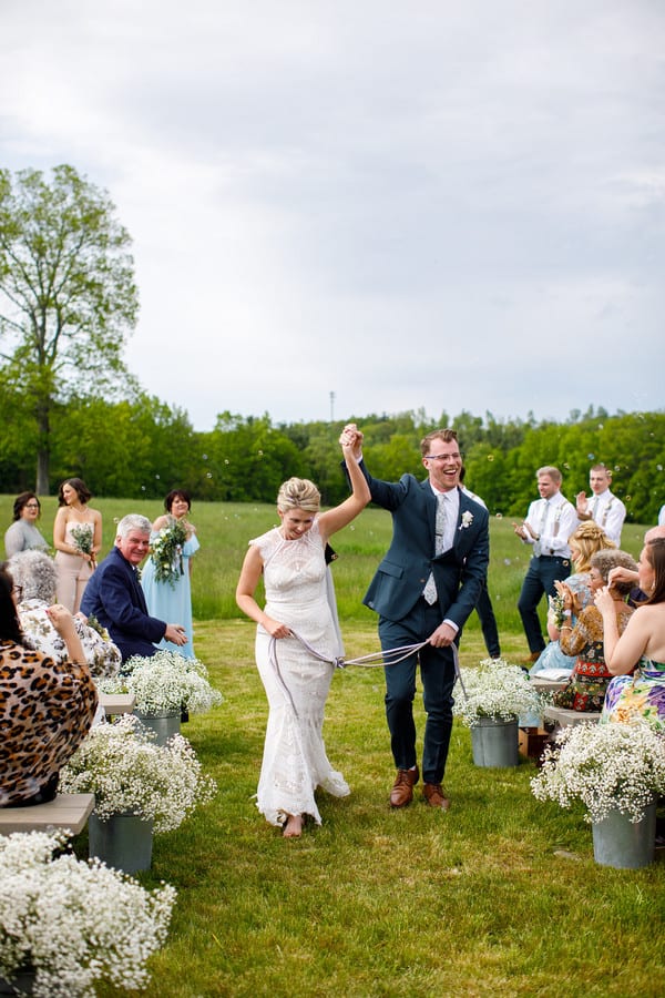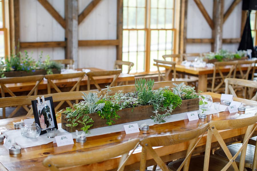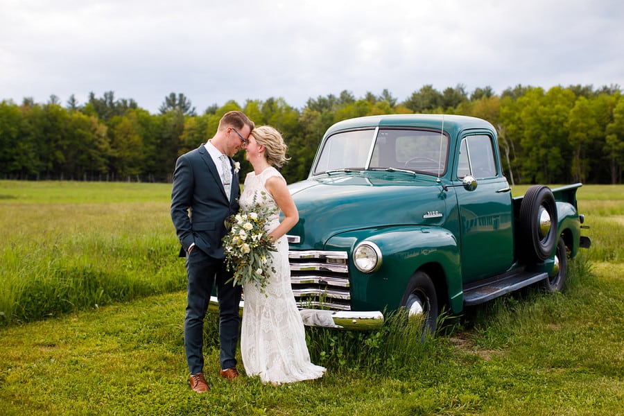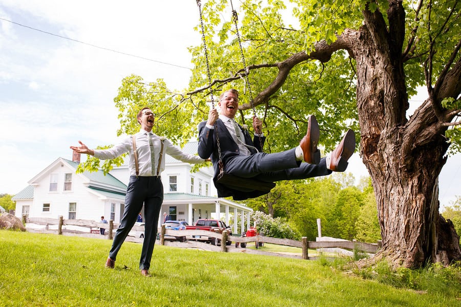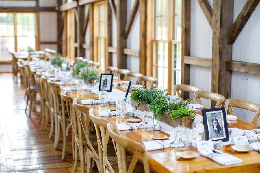 Photographer’s Comments: “Bryan and Kathryn’s wedding day was absolutely lovely! I love Valley View Farm, it is such a versatile space with an incredible staff. Bryan got ready in the newly renovated sugar house, I love the paint color change and decor; while Kathryn and the girls got ready in the love nest. Everyone was so relaxed and full of joy! I love that Kathryn was the one popping the champagne and serving her bridesmaids. I also ADORE the bridesmaid’s dresses, I love that they don’t match…each one was so different and flattering on each girl. “Their ceremony took place outside in front of their closest friends and family. One of Kathryn’s bridesmaids and friends performed the ceremony and did a fantastic job! I love the Celtic knot ceremony at the end. “We got the use of the grounds for formals, and the staff drove us around in a golf cart to various locations. Suzy, the owner of the farm, let us into the horse pen and we got to get up close and personal with the beautiful creatures.” The reception took place in the barn, and was full of rowdy dancing and a donut bar…yessss!!! I loved the pictures of their pup on every table. Bryan handmade each of the boxes from reclaimed wood that were centered on the tables. Kathryn and Bryan’s guests gave them a sparkler sendoff at the end of the night.Gallery