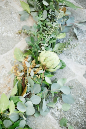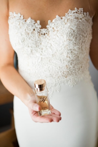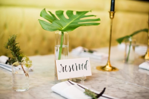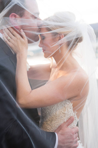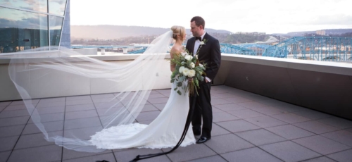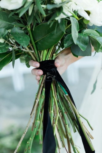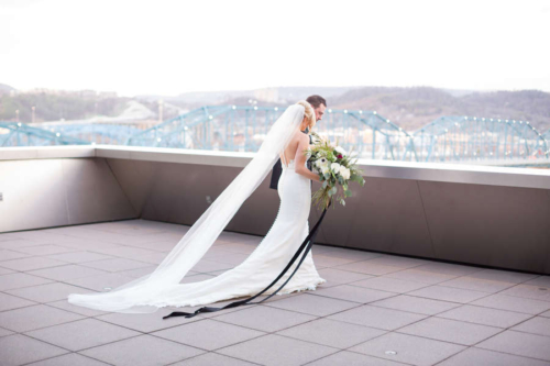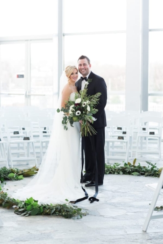 Q1: Tell us about your wedding!  A1: “Our wedding was nothing short of amazing to us. I knew I wanted something very different, out of the box- but classic. Something intimate and modern. We used black and white, and lots of lush greens to really make it pop. We didn’t get married in a church but definitely wanted our faith present. Our harpist, Ansley Unsworth, helped us choose music that fit exactly what we wanted. Hearing “Great Is Thy Thankfulness,”  while waiting to walk down the stairs with my dad was very calming and meaningful. My dad and I walked in to “Come Thou Fount Of Every Blessing.” I will never forget those moments. My favorite thing our minister did was to ask our guests to raise their hand towards us in prayer. We had no idea he was going to do that. It was so heartfelt and moving, it naturally brought me to tears.” Q2: Let’s talk wedding decor. A2: “For the ceremony, we wanted a circle seating arrangement for all our family and friends. Talk about intimate! The backdrop was large glass windows that view the river and other scenery we didn’t want to block. Our alter was 2-floor garlands with a mix of greens, and my favorite element for surprise, an artichoke! It was simple yet made a statement. The simplicity of it made us feel closer to our guests, and it didn’t distract from the moment of marriage. Our focus was each other and when our attention was brought to our scripture readings, we were able to make eye contact with them as well as our guests. We were so close to everyone, it was truly so special. Our reception was dramatic and elegant, moody and modern. Easy Bistro is one of the most beautiful spaces in Chattanooga. With its painted black walls and ceiling with white columns and mirrors, I knew that was the perfect space to pull off the black and white color palette. The space itself is art. We used black taper candles with gold candlestick holders, monsteria leaves in apothecary vases, gold cylinders with a mix a greens, similar to the ceremony garland- with artichoke and all!” Q3: What were the florals like? A3: “It’s easy to say that flowers were the most important thing to me. I definitely had a vision and knew Field & Flora would bring it to life. Our flowers and greenery were natural, texturized, and wildly beautiful. My bouquet was long stems, long ribbon to floor, blown-out white flowers, a few dark ranunculi, artichoke, magnolia leaves, lush dark greens, dramatic, big, and not a tight bouquet. It was stunning, better than what I imagined. Every element of the flowers were designed to complement both spaces and coordinate with my bouquet.” Q4: Did you personalize the day in any way? A4: “We have a black labrador named Hampton. And since he couldn’t make it to the wedding, we used his cute little self throughout the day. Jeremy and I had black lab pendants, his on his boutonniere, mine on my bouquet. Laura Cleary Art designed all of our paper. She painted a watercolor of Hampton that we used on our save the dates, thank you cards, and welcome sign. He was also Jeremy’s groom’s cake and we named our signature cocktail after him. Getting ready with our friends was such a wonderful way to start the day. I rented a house to give us more room, and to have more of a home feel to hanging out with my girlfriends. They spoiled me with making tons of food and mimosas for us to enjoy throughout the whole day. Jeremy and his buddies met early, played golf, drank beers, and enjoyed the 80-degree weather- what a shock in February! Before our ceremony, we had a champagne cocktail hour.  Our guests arrived to champagne and visited on the terrace. I surprised Jeremy with a cigar bar! I don’t know who loved it more, Jeremy or the guests!” Q5: Let’s talk fashion. A5: “I knew I wanted a certain silhouette and material. Monica’s didn’t disappoint! I went with my mom and best friend and after much thought and discussion, decided on a beautifully detailed crape dress. The dress had buttons all down the back, white crochet lace on the train and at the top. The dress had an illusion of being strapless but was a nude-colored mesh that provided more comfort than a strapless dress. I knew I wanted a long train and a floor-length veil- that was something than I had imagined since I was little! I borrowed my cousin’s vintage earrings that she wore in her wedding. My dress didn’t need much accessorizing, it would have taken away from the dress. For shoes, I wore a metallic gold peep toe heel with an ankle strap. Jeremy wore the all-time classic and favorite black tux. He felt that most fit him and the look of the wedding. My groom was so handsome!” Q6: How did you meet? Tell us about the proposal. A6: “Jeremy and I met a long time ago, but were on different paths in our lives. We reconnected years later through his cousin and her best friend, who was interning where I work. He reached out, he asked me out, and we never looked back. Jeremy proposed on a Wednesday- I was so surprised! He knew he had to use our dog when proposing. So after many thoughts on how to incorporate Hampton, he decided home was the best place. When I got there, he told me we had dinner reservations because we had lots of things to celebrate! He began to list them, and said he had 1 more. That moment, he got down on one knee, Hampton sat beside him, and he asked me to marry him! After saying OMG a million times, I said yes. Of course I didn’t even see the ring, but once I did, I couldn’t believe it. It was a yellow diamond, something I wanted but didn’t know he knew. Icing on the cake.” Q7: What was the most anticipated or special moment of your wedding day? A7: “By far, the first look. Seeing each other was for sure the most anticipated and special moment. It was so exciting, neither of us were nervous. It was something just for us and it eased all the nerves for the rest of the evening.” Q8: Do you have any wedding planning or marriage advi