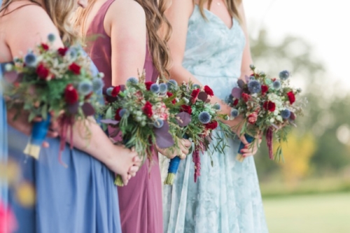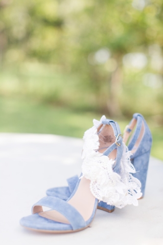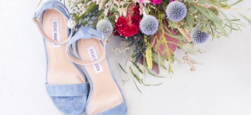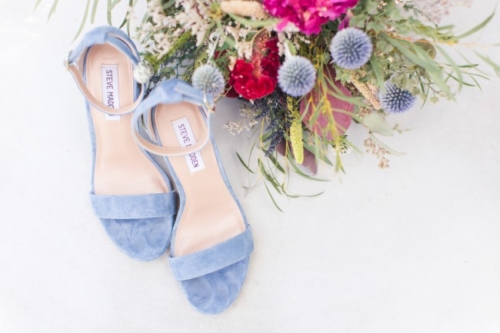 • We love how the bride’s powder blue Steve Madden heels pull out the color of the blue thistle bridal bouquets.