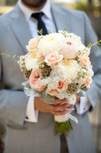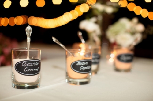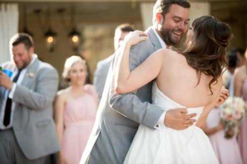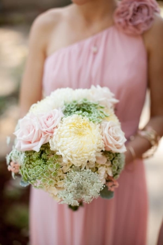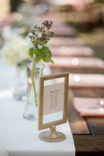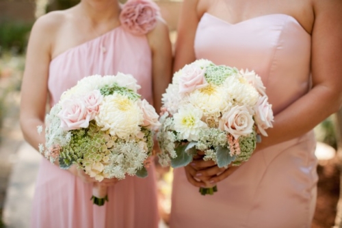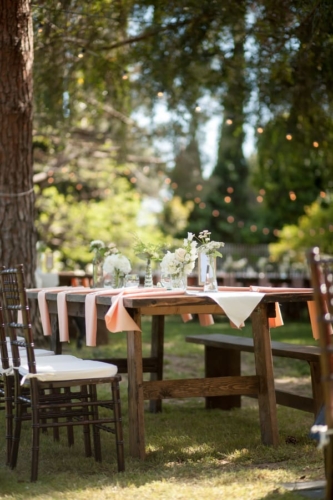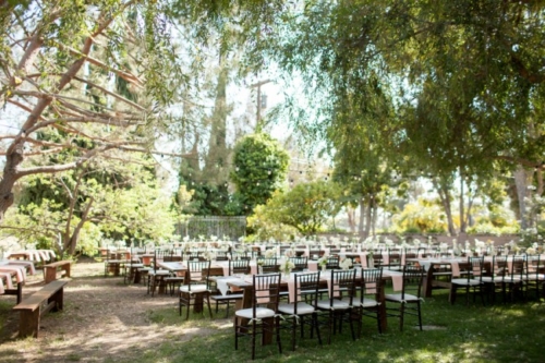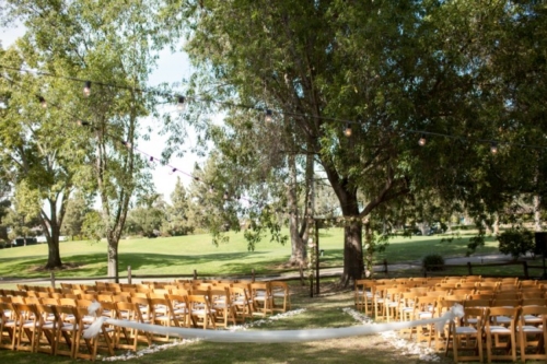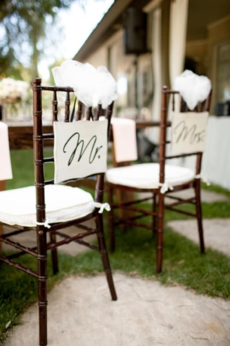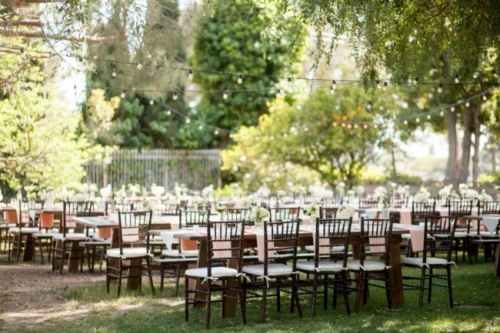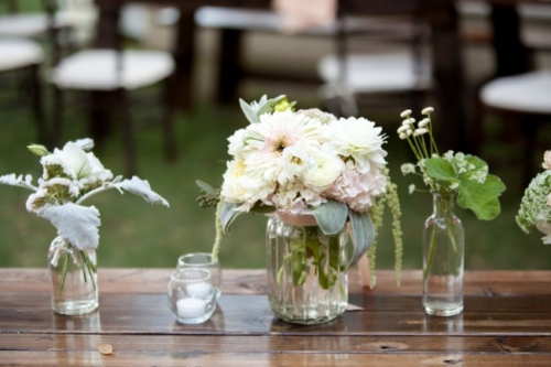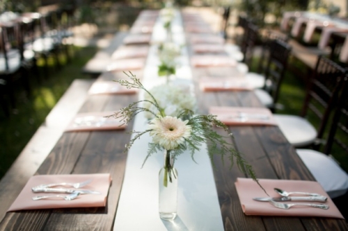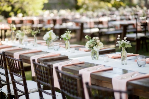 I am starting to think backyard weddings are the way to go.  okay, this one may not count because it was at a country club, but the simple elegant décor could truly be accomplished in most reasonable sized backyards.  The long dark wood tables with white table runners, pink napkins, and mismatched clear vases with flowers all give off the look of a formal state dinner. The use of dark chevalier chairs finished with crisp white cushions takes this chic backyard wedding up a notch from California picnic to fine dining in the park!