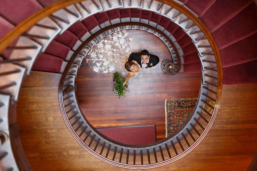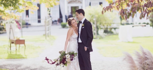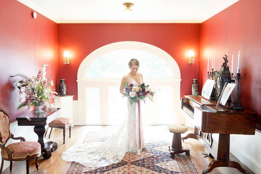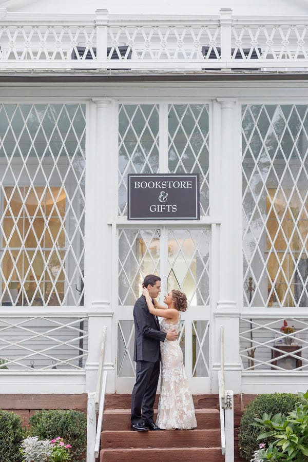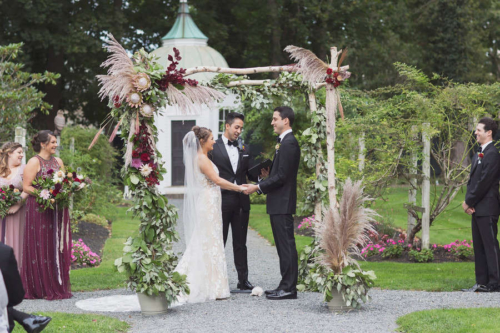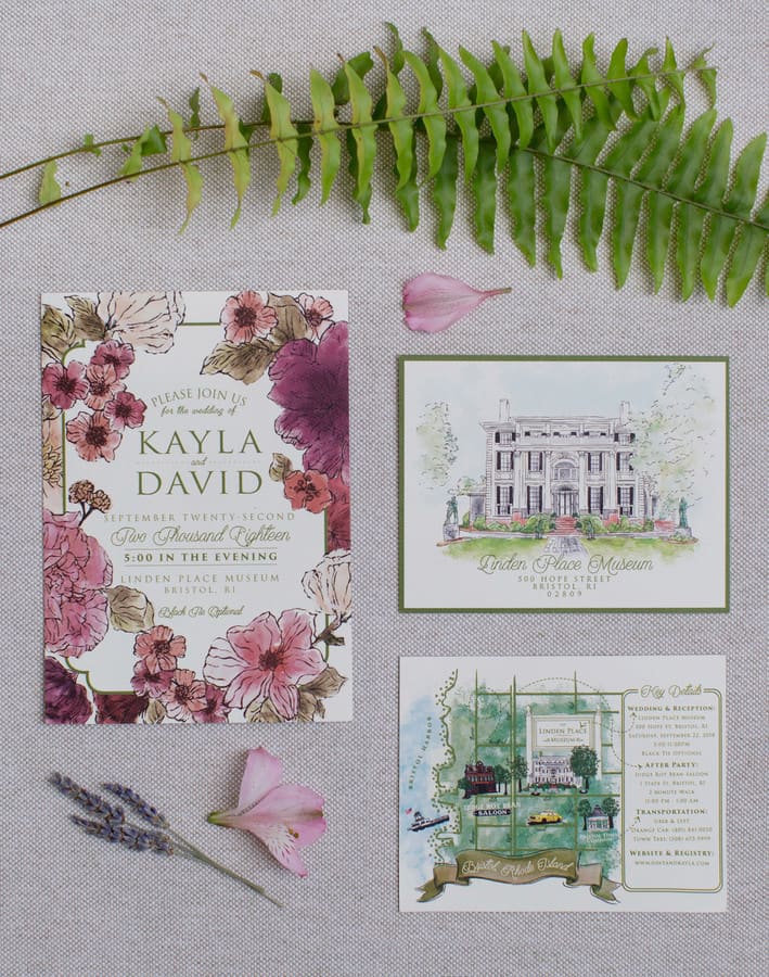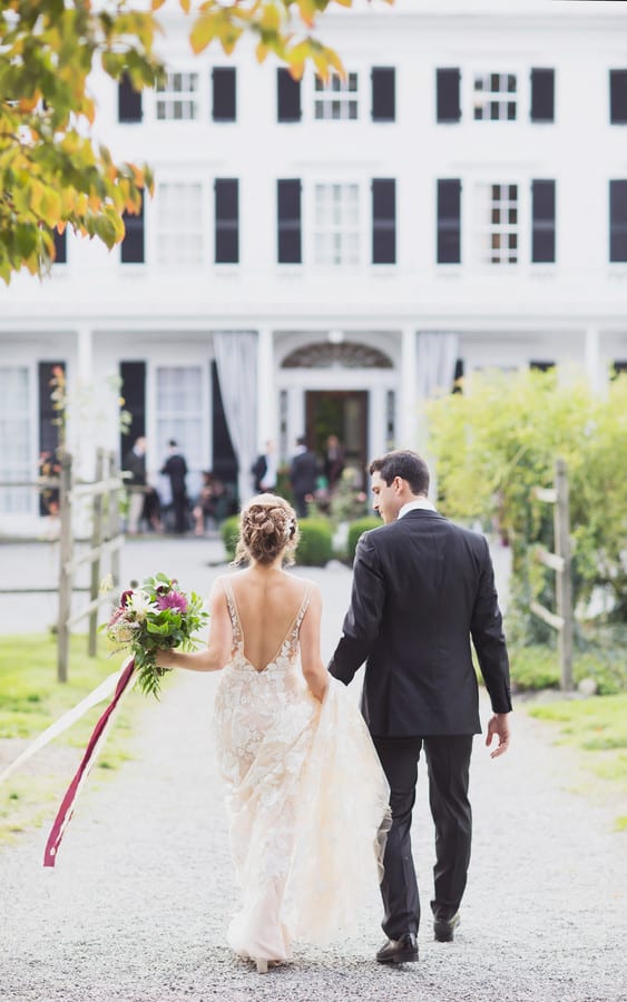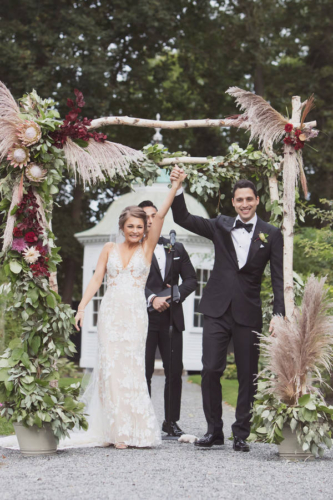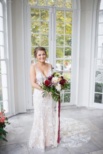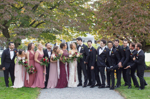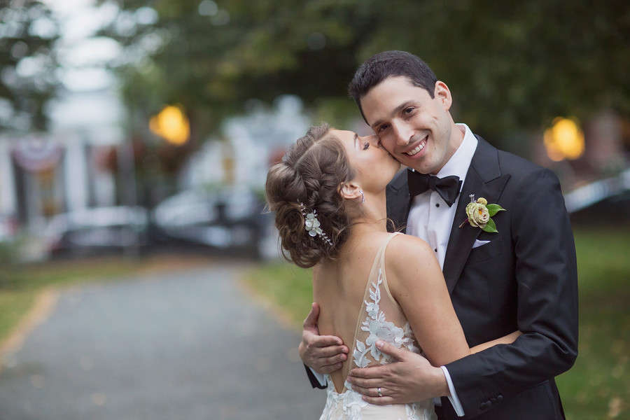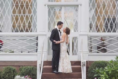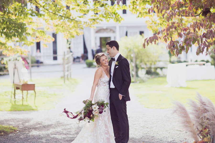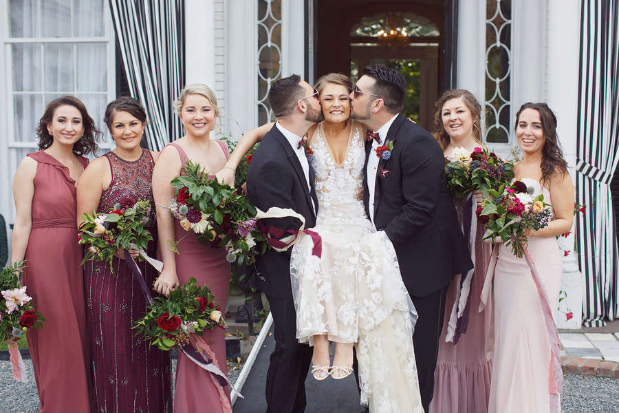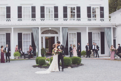 Photographer’s Comments: “By day, Linden Place serves as a historical museum in the seaside town of . By night, this mansion serves as a unique wedding venue, steeped in antiques and history! Linden Place was built in 1810 and is a historical landmark in Bristol. All of the furniture is original and the rooms with decor have been preserved. This was the perfect place for Kayla and Dave to tie the knot as Kayla is a self-proclaimed antiques lover. “Kayla and Dave had a romantic outdoor ceremony in the sculpture garden behind the mansion. With a chuppah that was draped in garlands of greenery and giant pink protea flowers, this happy couple said their “I do’s” while incessantly smiling (and sniffling). After the ceremony, guests were invited into the historical ballroom for dinner and dancing. We loved all of the traditional New England appetizers that Blackstone Caterers served–mini lobster rolls and baked stuffed clams! During the speeches, one of Kayla’s best friends had a spontaneous chair break, and he ended up on the floor in disbelief. Having a photojournalist document the wedding really helps to preserve moments like this. Kayla and Dave started off the dance party with the hora (one of our absolute favorite Jewish wedding traditions), followed by lots of wild dancing and limbo action.”Gallery