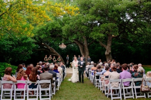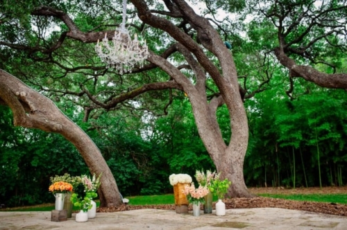 • Nothing says outdoor vintage wedding ceremony more than a large chandelier hanging from the trees overhead. I would not want to be the person who has to climb that tree to retrieve the chandelier!