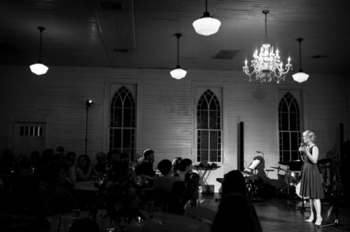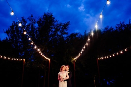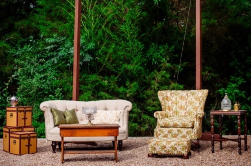 • Vintage wedding at Mercury Hall with a quaint seating area underneath strings of outdoor lights. A wonderful way for guests to mingle outdoors and maintain the vintage atmosphere.