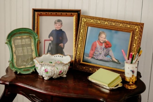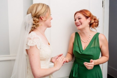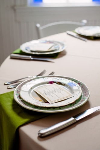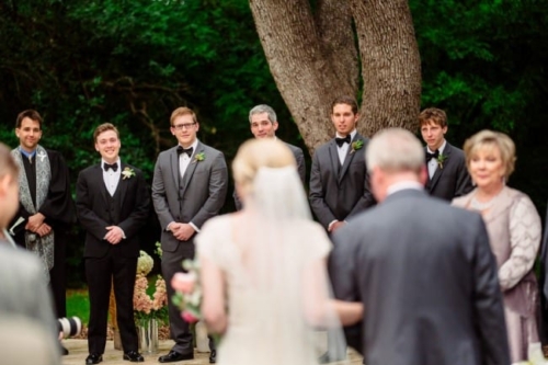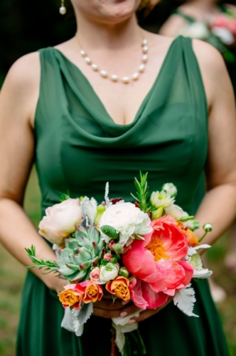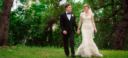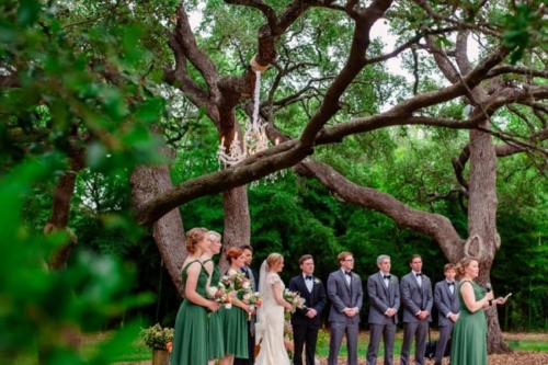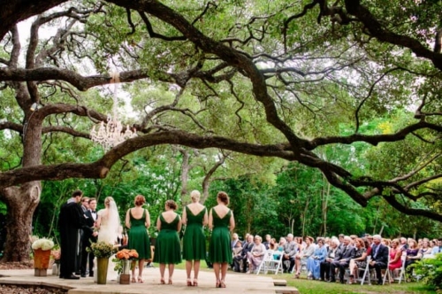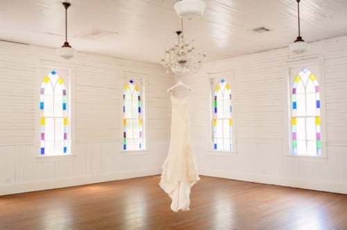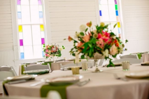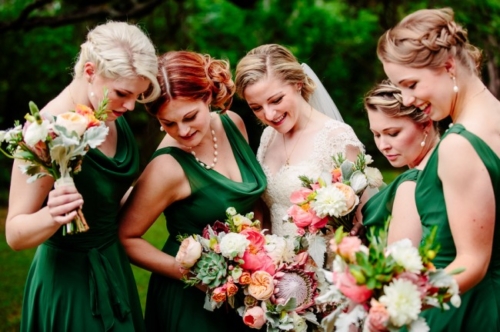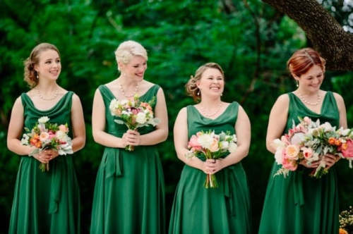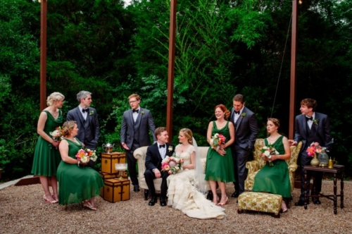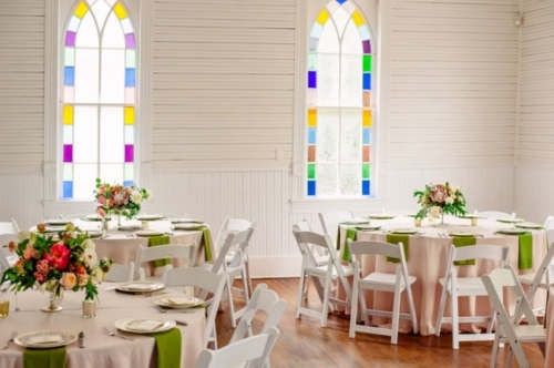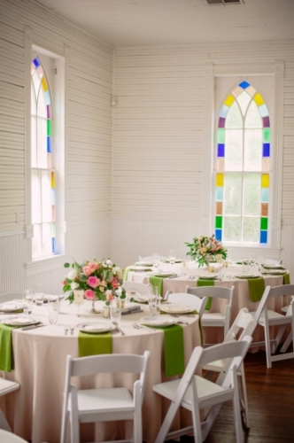 I never thought I would utter the words,  “I like green bridesmaids dresses.”  Today’s vintage wedding at Mercury Hall has made me a convert. I think the forest green dresses look absolutely stunning and provide relief from the usual pink bridesmaids dresses we see. (No offense to any brides out there – I am guilty of choosing a blushing pink bridesmaid color too!) Once built as a church in 1904 (hence the stained glass windows), the building was then moved to its present location in 1997 and turned into a great wedding and event venue.  The design of the building makes it look quaint and cute, perfect as a wedding reception hall. At a capacity of 150 people, Mercury Hall provides you and your guests plenty of room to dance the night away! What We Love