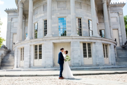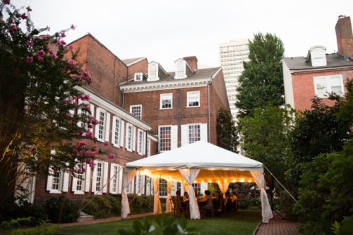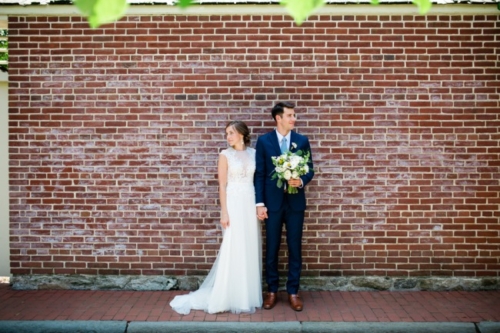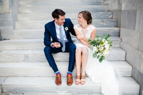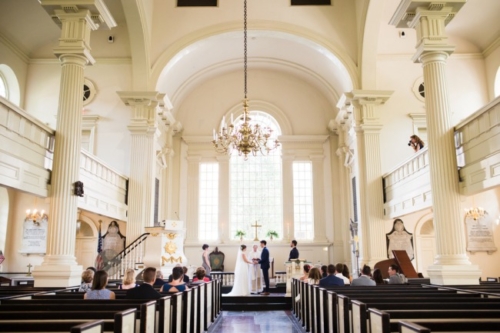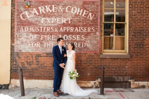 What is your favorite thing about the venue? “Before moving to Sweden, we lived in Old City right near Christ Church. We attended services here and really connected to the openness and warmth of the community. “When we became engaged, we knew we wanted to come back to Philadelphia to get married at Christ Church. We also loved the history of Christ Church as revolutionary leaders such as George Washington, John Adams and Ben Franklin attended services there. “We continued the historic theme in choosing our reception location — The Powel House. This historic home in Philadelphia was the location of many revolutionary parties, in which the Washington’s, Adam’s and Marquis de Lafayette attended. “The connection to the founder of our college was so unique and we loved the outdoor garden, thus it was an easy decision to hold our reception here. What was the theme of the wedding, and how would you describe the day? “We had an intimate wedding of 30 people and are thrilled we decided to keep the numbers low. “Having lived abroad for the last 2 years, we were so thankful to be surrounded by our loved ones and to be able to spend quality time with each of them on our wedding day. While we didn’t necessarily have a theme, the experience we wanted our guests to have was relaxed and elegant. “Our invitations and decor were inspired by the Powel House garden and our love of Sweden. Therefore, we incorporated lots of greens and the blue and yellow colors of the Swedish flag. “We adored how Belovely picked up these accents in our floral arrangements. We also incorporated other aspects from our life in Sweden, with a Dala horse at our welcome table and glass milk bottles that held our table florals.” What will you remember most about your wedding day? “One of my most favorite parts of the day was just after our first look. I showed Jeff a bracelet I was wearing, which was his late mother’s. “I had borrowed the bracelet from his Dad, but had no idea that Jeff had actually purchased the item for his mom. When Jeff saw the bracelet, after many years, he was at first confused thinking he’d bought it for me. I informed him that while he had purchased it, he had not bought it for me. “Then, it clicked. It was a very emotional moment for both of us as it was so important to feel her presence on our day. “We also LOVED having Weckery’s Ice Cream as our dessert. This company is one of our favorites in Philly and with neither of us as big cake lovers, we knew this would add a unique, local flair to our wedding dessert. Our guests loved the seasonal flavors and mini ice cream sandwiches.”Gallery