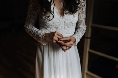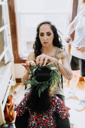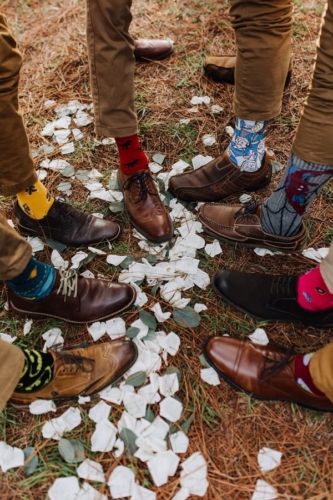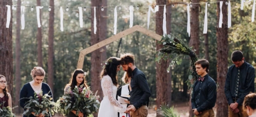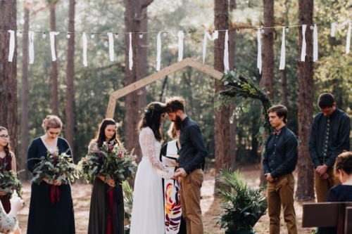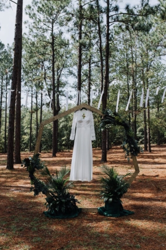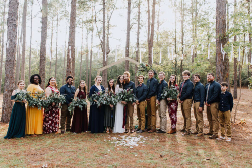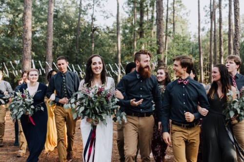 Photographer’s Comments: “This wedding is the most thoughtful, personal, intentional detail filled wedding I’ve ever seen. It is overwhelmingly full of DIY projects, nods to friends and family, and sweet touches. “Kelly & Matt met as camp counselors one summer at Bethel Christian Camp. For their wedding full of meaningful and personal details, the only place that made sense was Bethel. “The bridal party got ready in the cabins by the lake: a girls’ cabin and a boys’ cabin, and the unseasonably strange heat, gave everyone serious nostalgia and added such a sweet layer to the excitement. “The groom’s mother styled Kelly’s hair with long gorgeous curls. A friend of the bride came in to do makeup. “They presented gifts to their bridal party in custom wooden boxes handmade by the groom. Each girl had a different necklace and each boy had a different floral tie or bow tie, all handpicked by the bride and groom. “Kelly wore her grandmother’s opal earrings, necklace, and ring. Over the past few years, Kelly had written notes to her future husband: prayers, thoughts, dreams, all without knowing who he would be. She handed a small pile of handwritten notes tied with ribbon to Matt the morning of their wedding, including one she wrote the night they got engaged saying, ‘I finally know who you are now!’ “Like two kids sneaking out of their cabins, Kelly and Matt met in the woods for their first look. Being in each others’ arms visibly calmed their anxieties from the business of the day. After sharing this sweet moment, the bridal party drove out to a clearing in the woods where the ceremony site was set up. “That morning, their team of great friends hung lights in the trees with white ribbons tied to the strings as well as set up a custom installation made by the groom. The bride created all of the floral designs including bouquets for her and her girls, flower crowns for her flower girls, a corsage for her future mother-in-law, a pin for her hair, and the impressive greenery on the ceremony arbor. “The ceremony was officiated by a friend who was the minister at a local children’s home where Kelly and Matt have both worked and volunteered. Kelly has even been a foster mom to some of the kids. “The reception was held in the camp dining hall which had been decorated with more string lights and photos of the couple throughout their relationship. “To keep with the intimate and personal theme, the food was potluck and provided by their friends and family. For dessert, instead of the traditional cake, there were several options with their own significance. “To honor family members who had passed away, each option was the favorite dessert of one of their loved ones. Matt’s father passed away earlier in the year. His favorite had been apple pie, so on top of the display sat a perfect apple pie. To further honor his father’s memory, Kelly and Matt married on Matt’s parents’ wedding anniversary. “After their first dance, Matt helped Kelly take off her shoes so she could more comfortably dance barefoot with her dad. Literally just married, and he’s already loving and serving her so well. To cool off after dancing for a while, Kelly and I sneaked through the kitchen to stand in the walk-in cooler. Every southern wedding should have one of those! “These are only the highlights. I could go on and on about all of the wonderful things that made this wedding day so perfectly them. “I should also note that in keeping with the theme, Kelly honored me by not only hiring me as her friend but as a fellow photographer. She has assisted me on several weddings so it was a joy to have her on the other side of the lens!”Gallery