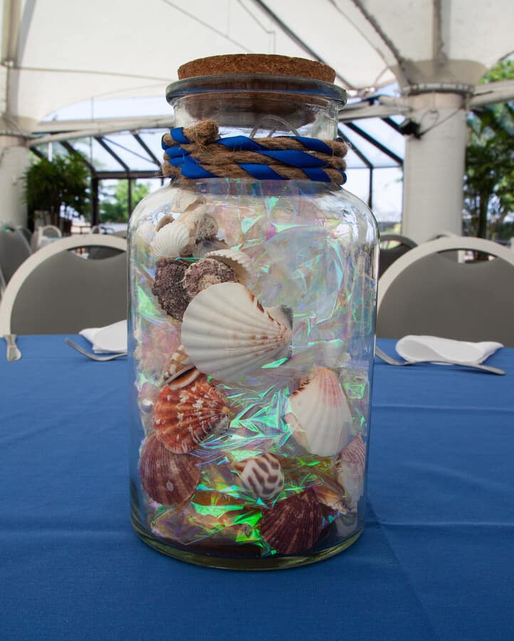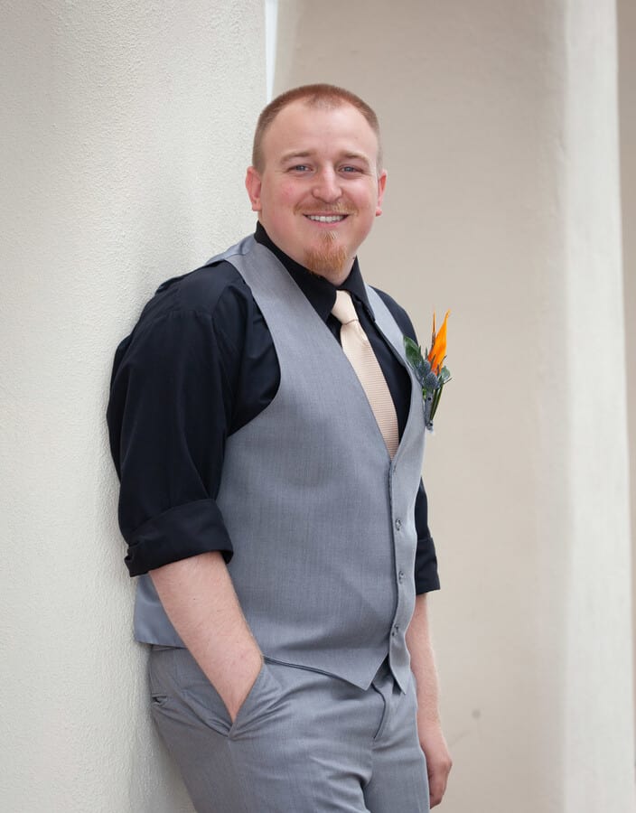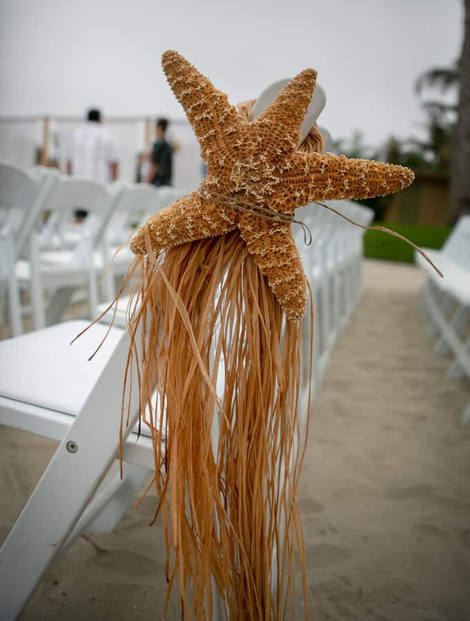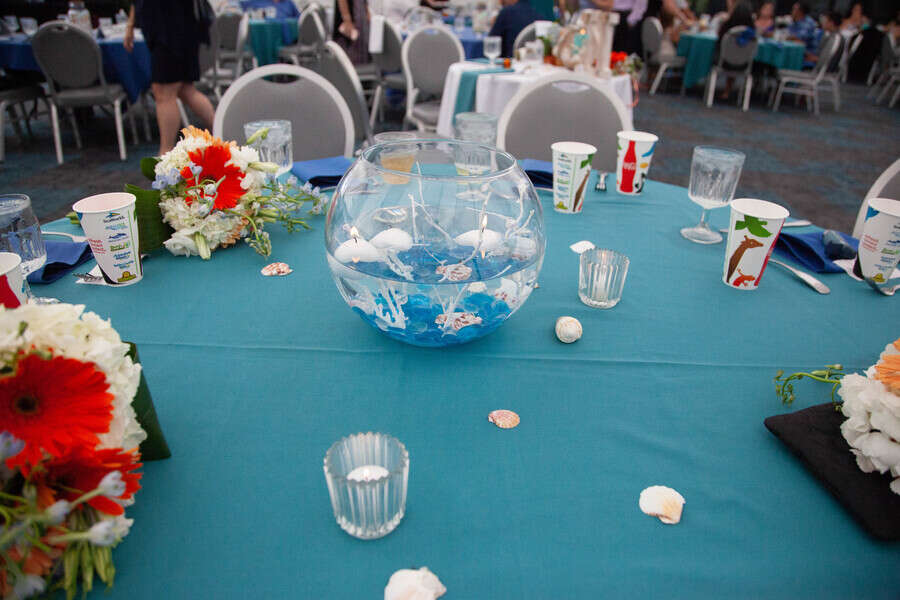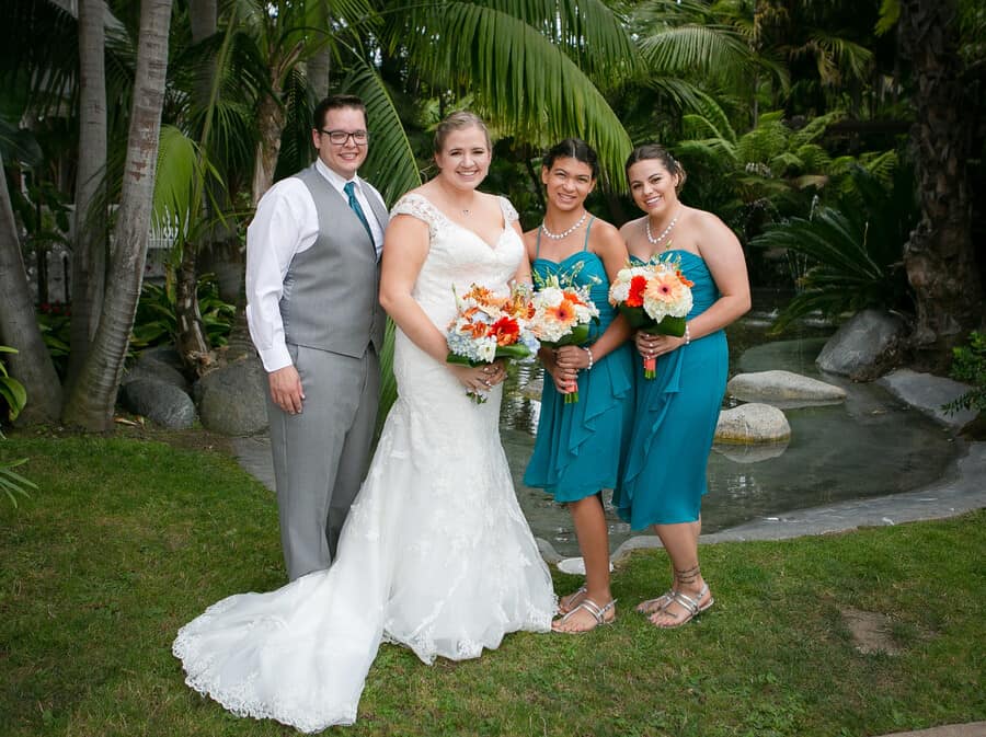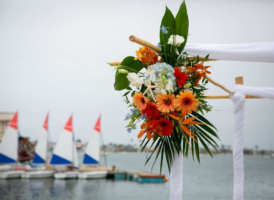 Q1: Tell us about your wedding! “He is an avid fisherman and she is a marine biologist, so they are both very aquatic people. We wanted to have our wedding themed and colored like the beach. Lots of blues and whites with some green and orange mixed in. “We also had a very large representation of the groom’s paternal family who are Danish. His grandfather and many of his great aunts and uncles came to the US and the groom’s father was the first of his siblings to be born in the US. Being that there are such strong ties to the Danish traditions among his family, there was Danish Akavit, the company from Denmark that makes the Schnapps, and Danish songs to celebrate the wedding. Q2: Let’s talk wedding decor “We couldn’t choose just one style of centerpiece, so we had a building party with friends and family to build 3 different styles of centerpieces. One filled with sand and shells and a candle, one with coral, rocks, and water with floating candles, and one with blue transparent sullifane and shells with lights to brighten up the colors from the materials and shells. “We also decorated a giant fish mailbox to hold all of the cards from our guests.To symbolize where he proposed on the Elk River in Southern Oregon on his grandpa’s property, we asked his grandparents to bring down river rocks from that river to use in a project. We glued shells and picture holders to each rock and used pictures from us growing up in separate ‘streams’ coming down into the confluence where they meet. The picture on that rock was our first picture together. “Further down, there were more pictures of us while we were dating, leading up to some of our engagement pictures.” Q3: What were the florals like in your wedding? “Our florist helped us match the beach theme to a mix of some tropical flowers as well as some beautiful regular flowers to match our color scheme. The bride’s bouquet included fun sea shells as well.Additionally, the groom spent hours in tackle stores searching for a bait to match to his boutonniere. after finding a bait of the right size and color, albeit for different reasons than he’s used to picking bait, he came up with the perfect accent to his boutonniere.” Q4: Did you personalize the day in any way (food trucks, guest entertainment etc.)? “Seaworld does such a great job with their food that we had lots to choose from. Pasta was an easy choice as it was the first meal that the groom cooked for the bride. The carving station satisfied the carnivores, and although it felt odd to have fish tacos at an aquarium park, they were a hit. “Most of all, the groom insisted on the mac n cheese bar. With various toppings, that was the favorite choice of the wedding couple.” Q5: Let’s talk fashion “For a beach wedding, the couple wanted to keep it simple, fun, and not too stuffy. “No jackets for any of the gentlemen and the ladies in fun dresses. Dark grey for the gentlemen, accented by fun sand and aqua ties as well as the bird of paradise boutonnieres made the outfits pop. “The bride spent a long time going shopping for her dress, finally deciding on her dream dress that made her feel as beautiful as she looked.” Q6: How did you meet? “The bride and groom grew up in the same neighborhood, went to all the same schools, and knew many of the same people their whole lives. However, despite their small age difference, were separated by one grade. “They met in high school when they took the same bus and became closer when they both were on their high school’s swim team. The groom distinctly remembers where they were, what event he was going to swim, what lane he was in, and which team the meet was against when he noticed a pretty blonde cheering for him at the end of his lane. ( It was at Poway High School, he was starting the 200 free, in lane one, against Vista High School.) “Their aquatic trend continued when they went on a date to go fish for rays, sharks, and bay bass in Mission Bay. Although the debate continues as to whether this should be counted as the ‘first date’, it was nearly 8 years to the day of then they would be married in that very same bay.T “he proposal was a long time in the making. They bride and the groom had agreed to wait until after graduating college to get engaged, but didn’t wait until much after that before the groom popped the question. “The groom had gone fishing during one winter break 3 years earlier with his grandfather in Bandon, Oregon for winter steelhead. Weather had been terrible, freezing and rainy the whole trip without a single bite. However, then the groom’s grandfather suggested fishing on his property  on the beautiful Elk River, the weather opened up and the groom decided that this was the place he wanted to propose. “The very summer after both the bride and groom graduated, the groom insisted on a solo road trip for 16 hours up the coast of California to Bandon rather than the trip to Hawaii. Although this was a hard sell, the groom ‘lured’ his biologist bride with stops at the Monterrey Bay Aquarium, a stop at the beach where Elephant Seals rest, the beautiful California Redwoods, and a place the bride had never been. “The day of the proposal, the groom planned a day of buttering the bride up with a morning trip to the Bandon tide pools for some biological adventures, followed by a visit to a local zoo that lets you feed deer, goats, rams, donkeys, peacocks, and sheep as well as interact with and pet exotic animals like snow leopards and bears. Under the guide of a stop to his grandpa’s property to fish for trout, the groom convinced the bride to saddle up in water boots and jackets for the river, the groom took the bride on a 20 minute walk trying to locate the spot he had been to 3 years earlier. After discovering he had hiked the wrong way and needed only to walk 100 ft from the car, the bride and groom decided to take a few pictures before starting to fish. “Sneakily, the 