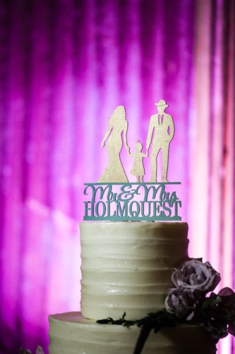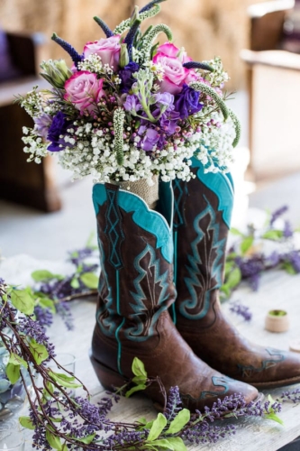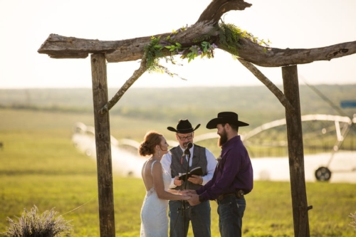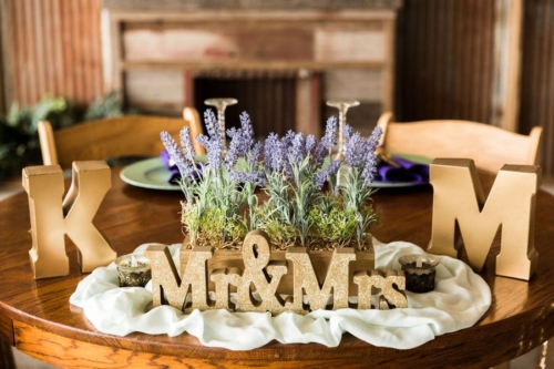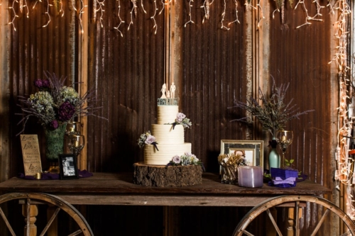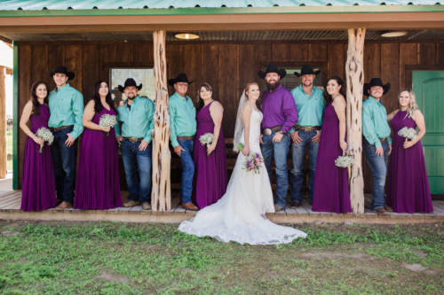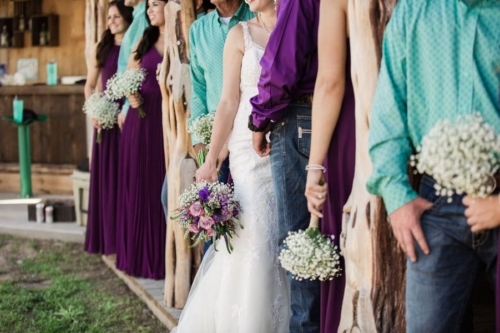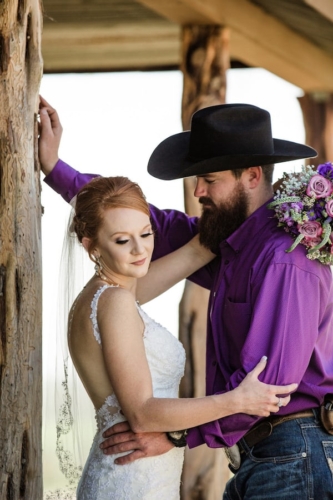 Q: Tell us about your wedding! “Our theme was sort of a rustic chic. Very outdoorsy, with lots of wood accents. Our colors were a deep purple, lavender, mint and a touch of gold! I like a little sparkle and shine, and my groom likes very simple. So we found something that was just a little of both. I think it worked perfectly! It really captured our personalities.” Q: Let’s talk wedding decor “There was lots of wood accents, flowers, a little gold sparkle here and there! My husband built our wooden arch for our ceremony which made it so special. My dad and I cut the wood we used for our cake stands off a mountain in my hometown all the way in Arizona. “My groom and I also cut and stained the wood signs we had down the aisle of our ceremony and I painted the wording. I loved having a little bit of DIY, I felt it made it very special!” Q: What were the florals like in your wedding? “We didn’t concentrate much on the floral aspect, our bridal bouquets and the guys boutineers were the only real flowers of our wedding.” Q: Let’s talk fashion “My groom is very laid back, and does not like suits! So it was only fitting to have him wear nice jeans, his old boots and a nice button up shirt. I felt it wouldn’t be right if he wore anything different! “My dress was ivory, tulle with lots of lace detail and a touch of sparkle on the top. It had a long train which I LOVED and an open back. I loved the way it looked with my boots, it was just enough pretty with a little but of country.” Q: What was the most anticipated or special moment of your wedding day? “I loved doing a first look! I felt it was a really special moment seeing eachother, just the two of us before our ceremony.” Q: Do you have any wedding planning or marriage advice to share with other couples planning their day? “My only advice would be to try not to stress over wedding planning. It is such a beautiful and special day no matter what! Enjoy the day, it goes by too fast!”Gallery