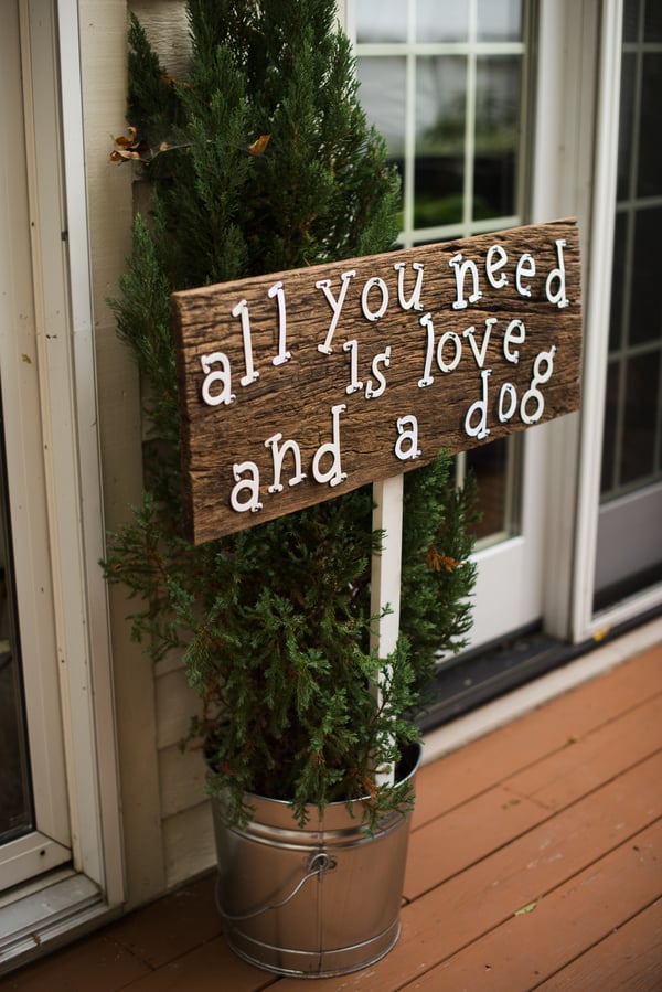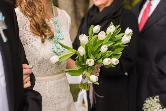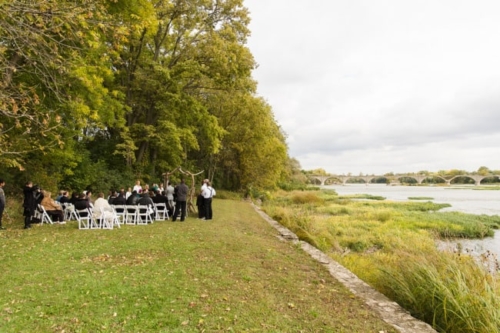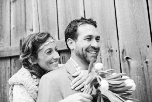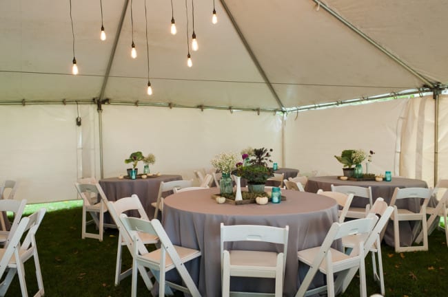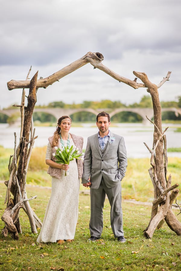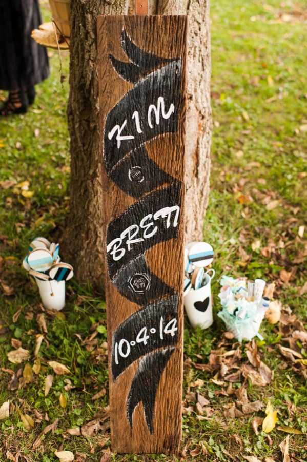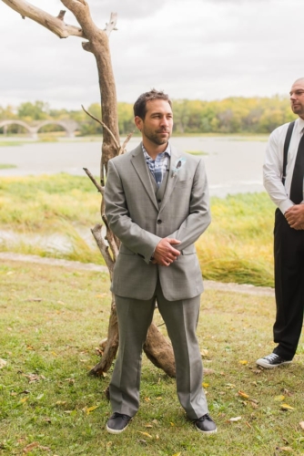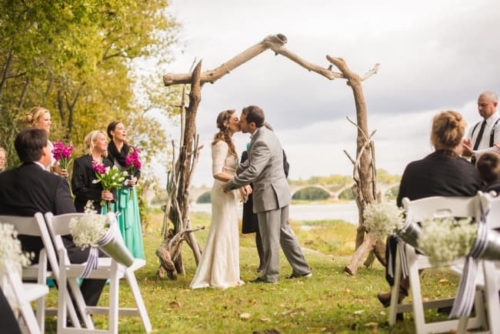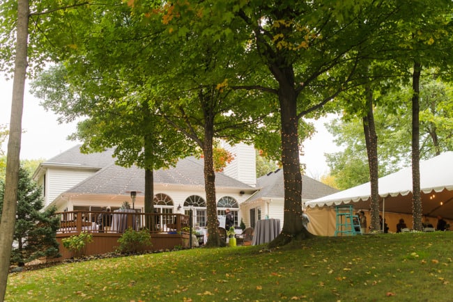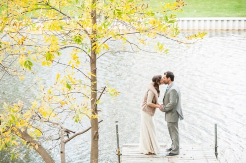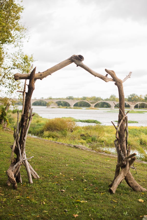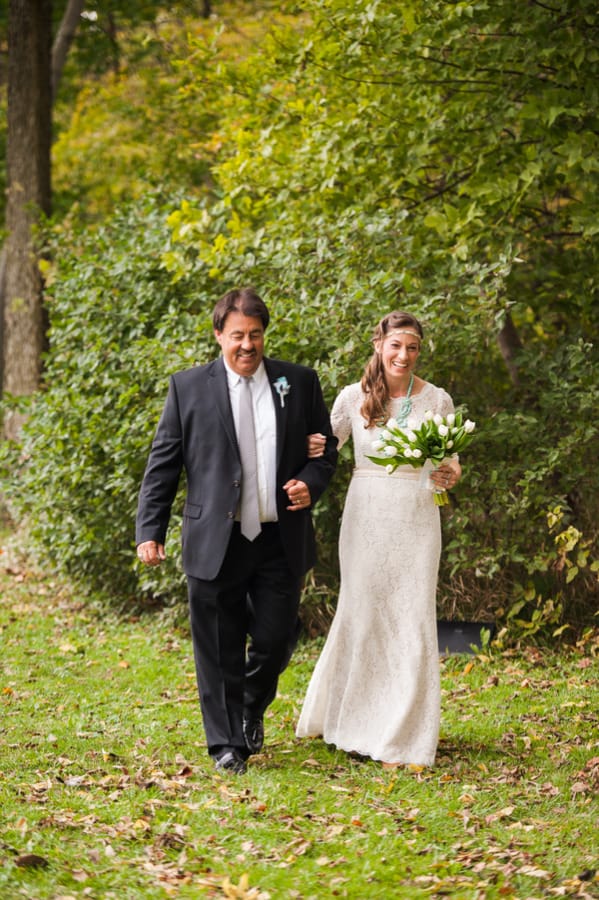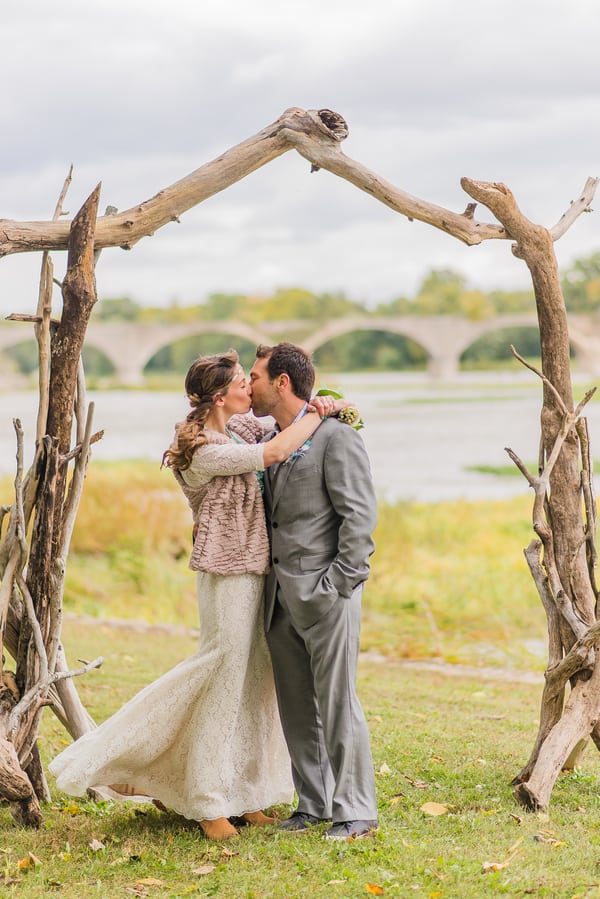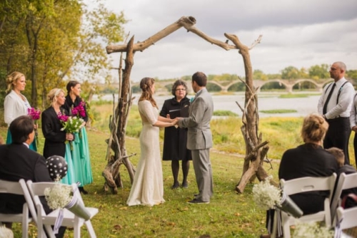 From the bride: “We wanted to keep the celebration simple, relaxed, and true to our taste & personalities. We are both laid-back, enjoy nature, appreciate good whole food, and don’t need a lot of fan fair surrounding us. We knew we wanted a intimate ceremony with only our immediate family. We picked our favorite spot by the Maumee River. It overlooks Roche de Bout, a limestone island that dates back to the 1700’s as a meeting place for Indian tribal councils. It also has a magnificent view of the old abandon Interurban Bridge. After our wedding ceremony, we wanted a small backyard celebration with our closest friends and family. We were hoping to allow our guests to enjoy our home & beautiful waterfront backyard. Unfortunately, the weather on our day was anything but beautiful. It even hailed 2 hours before the ceremony! We ended up getting a tent and heaters. Everyone bundled up, but we still had the most wonderful night. We wanted the food to reflected our taste as well. The chose a pig roast by Deets BBQ and catering by Cynthia’s Catering. Our friends said it was the best food they ever had. Roasted root vegetables, corn & grit casserole with cheese & bacon, mashed sweet potatoes, kale salad, tartlets with brie, Apple, & caramelized onion, & mini risotto balls filled with butternut squash, sage & goat cheese. It was all delicious. Red wine, sangria, & seasonal craft beer also helped to keep us warm.”