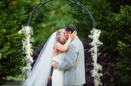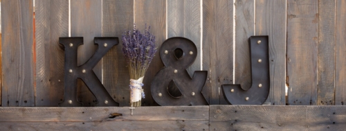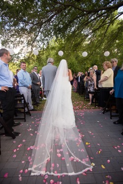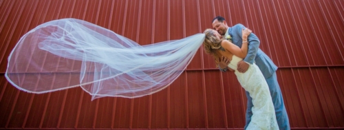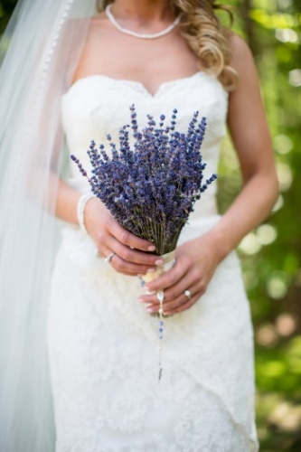 We love today’s featured wedding with lavender, lace, and a bride that really knows how to work her chapel length veil! Kim and James put together a cohesive wedding that looks as though it came together perfectly. Simply adore the rustic decor, burlap and lace drawstring favor bags, and of course how Kim and her photographer are able to pull of a dramatic veil shot!
