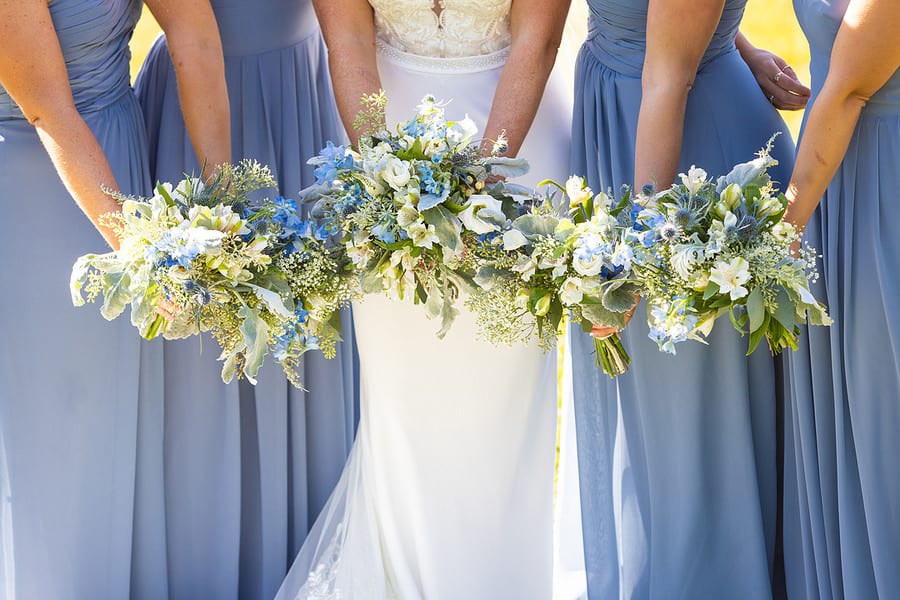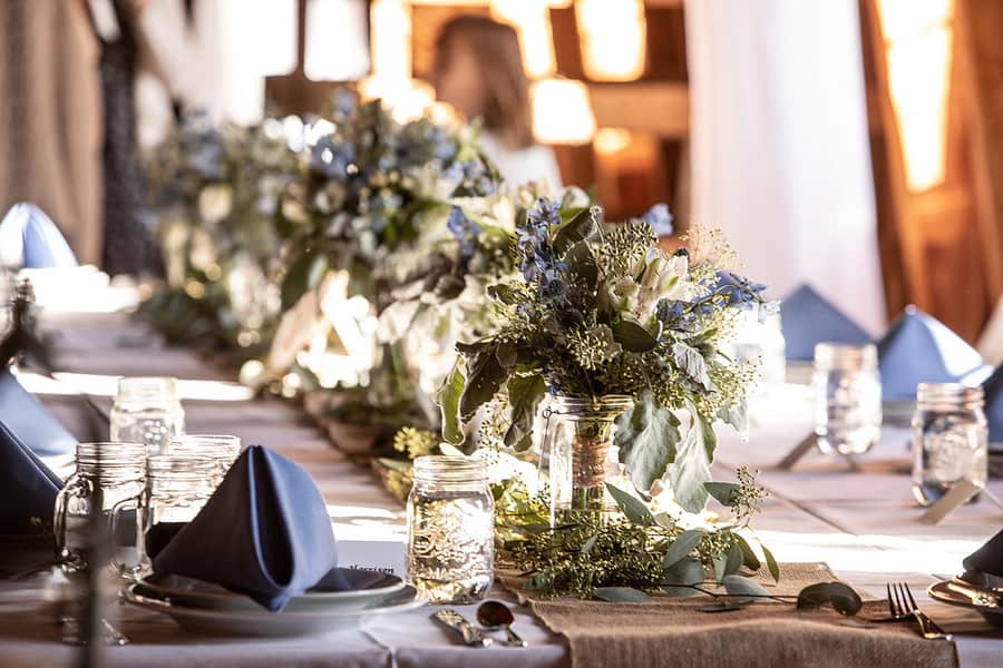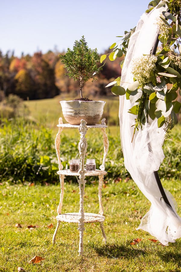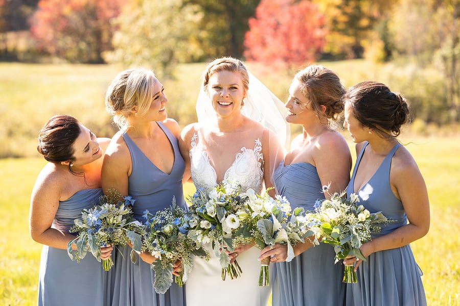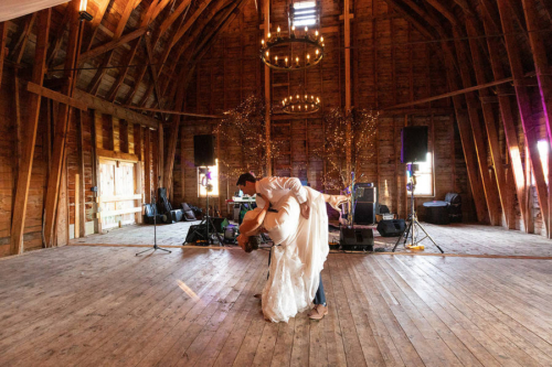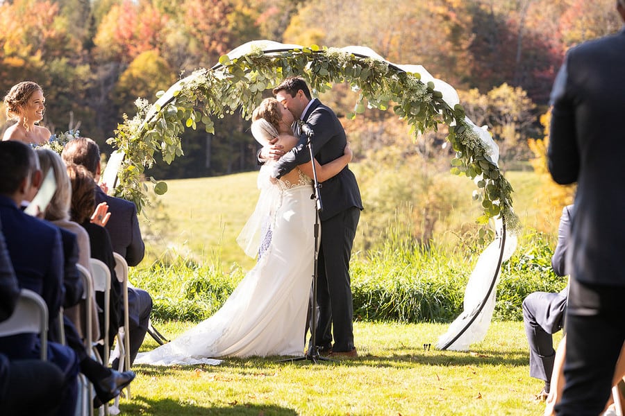 The wedding party caravanned through the mountains down winding dirt roads following handmade signs until arriving at the gorgeous and secluded red barn estate of Saltash Farm in . Saltash Farm’s endless rolling hills with vibrant foliage leaves popped in every direction. Kristen and Kevin’s ceremony was under a canopy of trees in front of a stunning circular wedding arch. Kevin swung Kristen over and dipped her for their first kiss while their guest erupted in cheer. Their first dance was another spectacular performance filled with lifts and dips.