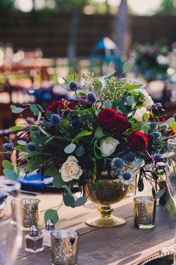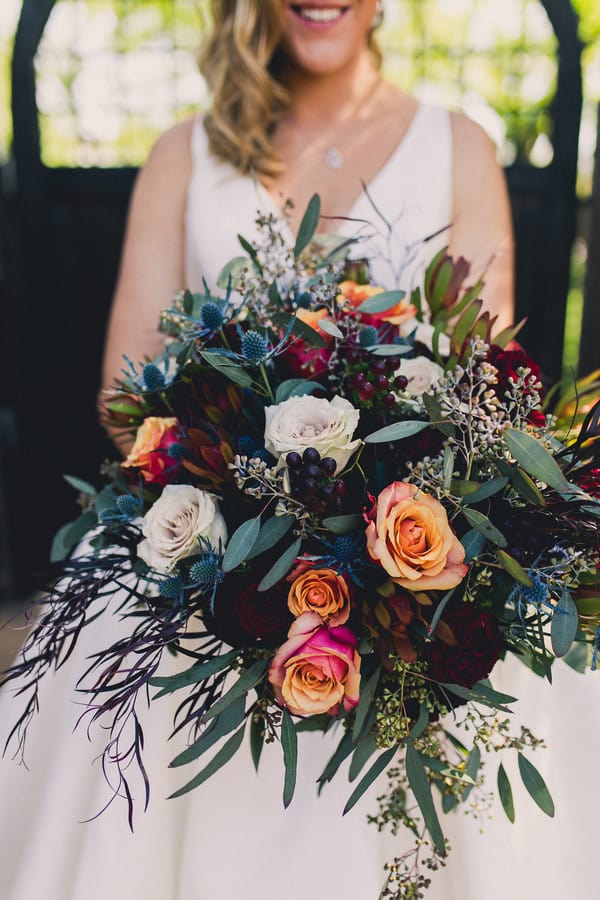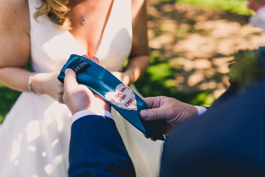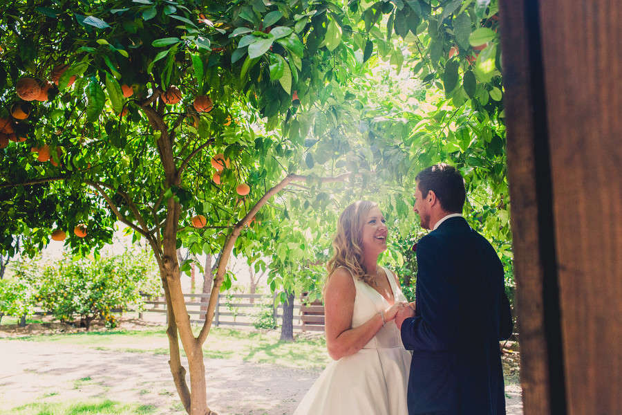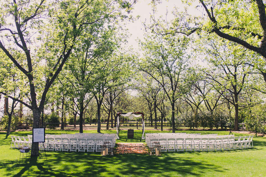 What’s your love story? How did you originally meet and fall in love? “Nick and I met at work. We work at a construction company, me being in Marketing, and him being in operations. The first time I met him was through email when I asked him for information about one of the projects he was working on. “It wasn’t for another couple months that we met face to face when he was in the office and introduced himself to me. Our professional interactions grew into friendship over the next couple of years as we started to spend more time together outside of work. “After two years, we both felt there was something more between us, and we both decided to take a chance on each other. From that moment on there has never been a single doubt in either of our minds that we fit together perfectly. “We spent the next three years doing just about everything together. Between traveling all over the United States and five different countries, to tackling multiple home renovation projects, and even spending an entire year apart while Nick ran a project in Texas. “We never wavered and only grew stronger. While our story is simple, our love is beautiful, perfect, and epic.” How did your proposal go? “We were back in Omaha, NE visiting Nick’s family for the holidays. On the night of December 27, 2016, he invited his parents, sister, and brother-in-law out to dinner to a restaurant in the historic downtown area of Omaha. After a wonderful dinner we all walked around the Gene-Leahey Mall. “Everything was covered in fresh snow and there were Christmas lights hung on every tree and building. It was beyond romantic like we were in a true winter wonderland. “I kept asking to take a picture with all the snow and lights, but Nick kept suggesting that we go up a little further to take the picture, which looking back should have been an obvious sign something was up. Eventually we got to this beautiful overlook point with the whole mall lit up behind us where Nick stopped us to take the photo. “After a couple of pictures, Nick began to slow dance with me which we so often did in our special moments. As we slow danced he started telling me about how much he loved me and how perfect we were for each other. It was then that it hit me – this was THE moment. “He said so many heartwarming and sentimental things – none of which I remember due to my complete shock – and then he got down on one knee and asked, “Larissa Ta…. Larissa Nicole Tavelli (he told me later he said the one thing he wanted to remember was my middle name but stumbled during the first try), “Will you Marry Me?” “When he pulled out the ring, I don’t think I could have ripped off my glove any faster. I was so excited and overcome with emotion I barely managed a squeal and a head nod to tell him YES!!!! I was so happy and still in disbelief that I didn’t even remember to look at the ring until we were heading back inside to get out of the freezing weather. It was such a beautiful moment and he pulled it off perfectly. He says that he was the most nervous he had ever been, but he held it so well I had no idea. It is one of my favorite memories and we now visit that exact spot every time that we are in Omaha.” What was important to you about your wedding? “Aside from us both showing up, haha! We wanted it to be very personal. From the homemade jam my mother made for our wedding favors, to the quilt squares she made for our guests to sign, we also flew Nick’s pastor down from Omaha to marry us. “We wrote our own vows which we read during the ceremony which I think made everyone there feel how special the day truly was. We had heard, as most people do, that you don’t have a lot of time to yourselves during the big day so we made the decision to do a first look and I am so glad that we did. “There was so much going on that day with getting ready and making sure everyone was at the venue at the right time and all I wanted to do was to see my sweet Nicholas. “There was so much emotion, relief, and indescribable joy when I finally got to squeeze his butt for him to turn around and see me in my big, extravagant white dress. “We took that moment to soak up what that day truly meant, and continued to make a point to steal away little moments throughout the night to just be together, even if only for a few seconds. “As for the decor, we didn’t want to overdo the decorations or theme so we let our beautiful venue be the backdrop. Fortunately we had absolutely perfect weather as it was all outside. “The other thing that was important to us was that our guests had a good time. We had the best people celebrate with us that day, and they all organically mingled and had a blast and still talk about how fun and beautiful our wedding was to this day.” What was your wedding inspiration? “I really like bold, rich, moody colors, and even though it was spring, I managed to pull some of those colors in while still adding brighter shades to give a lighter feel.” What were your wedding colors? “Dark teal, navy blue, champagne gold, with pops of pomegranate red.” What made your venue the one? “Having grown up in the Southwest, I really didn’t want a southwestern wedding, and this venue was like you were being transported out of Arizona to a pecan grove somewhere else. “It had lush pecan and citrus trees with a vintage charm. I loved the light-wrapped trees and bistro lights over the brick where we had our reception. Throughout the day as the light changed our venue got more and more beautiful – it was the perfect feel for our day.” What were the highlights of the ceremony? “Our whole ceremony was incredible. The message our pastor gave about marriage and the commitment we were making to each other was heartfelt, meaningful, and personal. He incorporated things we had discussed during our pre-marriage counseling as well as things he knew about Nick and his family. “I would have to say my favorite pa