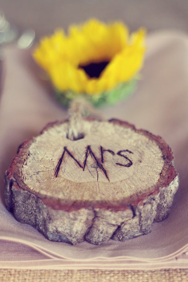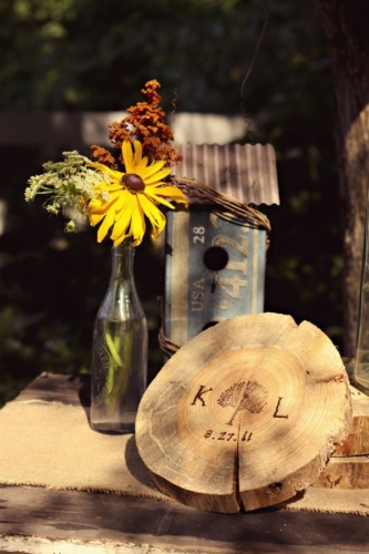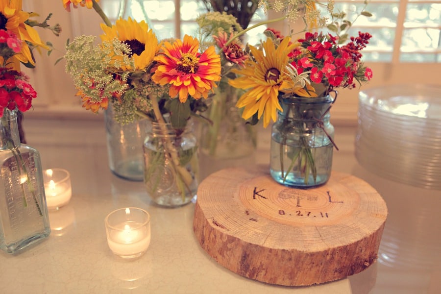 A tree stump from Laura’s childhood backyard was the canvas for their guestbook and they also used tree stumps that Kyle himself cut and branded with their name and wedding date as décor throughout the reception.
