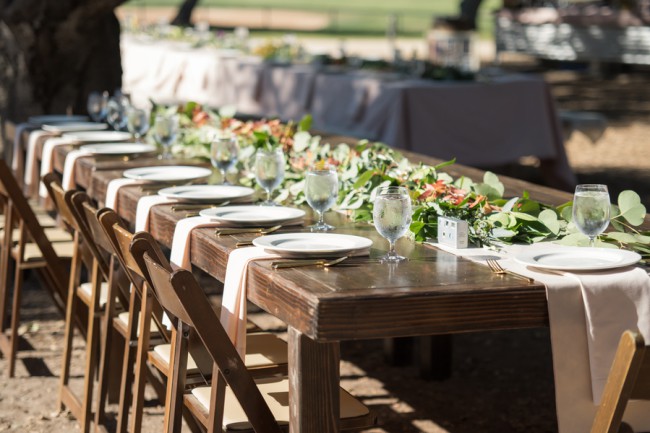 Sentimental gowns, vintage feel, elegant bridal attire, and ranch ready decor have us loving today’s fall wedding at a California ranch. With thanks to HeartsFoto for capturing Matthew and Laurel’s lovely wedding!