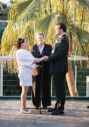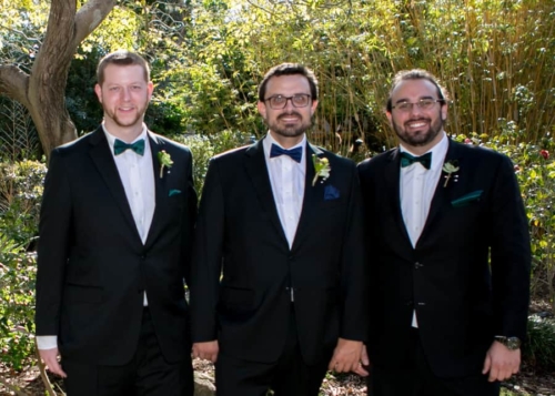 Q: Tell us about your wedding! “As we are animal lovers, we had our wedding and reception at the San Diego Zoo! The theme was animal based obviously.  The reception was done in ivory and chocolate brown.  Instead of traditional vows we had a handfasting ceremony!” Q: Let’s talk wedding decor “The ceremony site was a deck overlooking  a canyon in the zoo, with simple white chairs.  Every other row on both sides of the aisle had a beautiful flower arrangement of an orchid, grass and a monstera leaf. “The reception area was beautifully lit with amber lights going up the walls.  The tables had animal names and a small stuffed animal that matched the name.  The center pieces and runners were made by the brides mother.  The runners are fabric we picked out, and the center pieces are succulents my wife’s mother had grown.” Q: What were the florals like in your wedding? “They did not play a huge role in it all, but the idea was to bring nature into small scale and inside.  Our honey moon was in Hawai’i and as such we wanted orchids to be the center of all the arrangements.” Q: Did you personalize the day in any way? “We personalized our wedding by having it as the San Diego Zoo.  We had other small details scatted every where throughout the ceremony and the reception. “Our rings are custom made with our heartbeats engraved on them (Hers on mine, and mine on hers).  As she wears a size 2 (yes that’s right!) shoe, we had to custom order her shoes.  On the inside it has our names and wedding dates stamped into the sole.  In the reception area our love of animals was made clear by all the small stuffed animals at the tables and the ‘guest book’ table.  Our book was unique in that it was a large animal puzzle people could sign.” Q: Let’s talk fashion “We wanted to keep the traditional white/black but go more simple than tux/gown.  I wore a black suit with a blue bow tie and she wore a white cocktail style dress the glittered in the light.  Around her neck she wore a sapphire necklace that her grandmother lent her and in her hair she wore a tiara.  My bow tie matched her blue reception dress latter on.” Q: How did you meet? “We met while working at the grocery store Ralph’s. She was my trainer in the deli department.  On my first day I knew she was the one and as I was building up my courage to ask her out, I found out she had a boyfriend. “After a year of working and hanging out Lauren left Ralph’s.  We still hung out and had fun though.  A year after she left she came back and started working at the newly opened Starbucks Kiosk.  This time I was her trainer. “Then, 6 months latter her boyfriend broke up with her.  Having been through a bad break up a few years before I was there to support her and help her. (I knew the universe worked in strange ways).  Finally, 6 months after that the proposal! “This took a week of planning with the zoo as I was trying to work on getting a red panda (Her favorite animal) to be out.  She knew the day was coming just didn’t know when or where.  We had to ring shop together as she wears a size 4 ring. “The big day comes and we get to the zoo early and walk around a near by art village for a while.  once the zoo opened we went in and started to explore.  An hour or so later we are at the red panda and she was out eating from the keepers hand! “We were both excited seeing this — my dream had come true! After a few minutes and some difficulty getting Lauren’s attention she finally turned and I was on my knee with her ring out. “Seeing as how we are answering these questions, you can guess what her answer was!” Q: What was the most anticipated or special moment of your wedding day? “The most anticipated moment was the animal presentation during our reception.  It was actually 4 animals in 45 minutes.  This moment had everybody talking well before the wedding and we are sure for a long time after!” Q: Do you have any wedding planning or marriage advice that you’d like to share with other couples planning their day? “DON’T WAIT TO THE LAST MINUTE! “However, you’ll see that the closer you get the more things fall into place.  Oh and get a wedding coordinator early on.”
