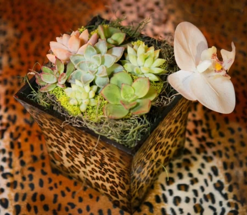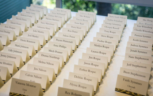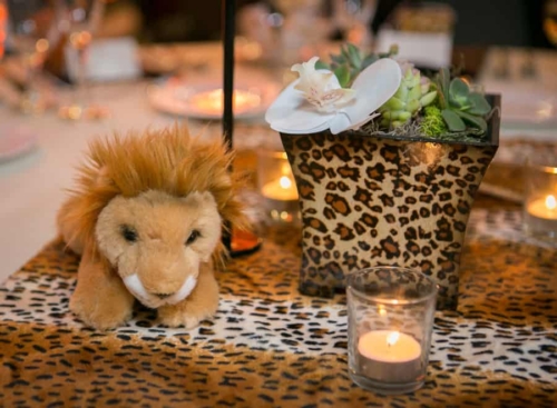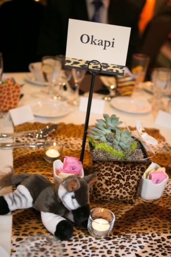 Photographer’s Comments: “Here’s the question of the day: If you are an animal lover – who’s love story included the zoo and you proposed at the zoo – wouldn’t you need to have your wedding and reception at the world famous San Diego Zoo…? Of course my bride and groom, Lauren and Brett answered ‘YES!’ “The bride and groom met in the zoo’s gorgeous Japanese Garden for their First Look then we Zipped all around the zoo capturing romantic and wedding party portraits with the couple’s favorite animals. (Cocktail hour included an animal presentation by the zookeepers – the couple met a Sloth, Bear Cat and Hedgehog to name a few. “The ceremony site was on the Treetops Deck overlooking a canyon in the zoo, with simple white chairs decorated with beautiful flower arrangements of an orchid, grass and a monstera leaf. (The bride’s bouquet included the same florals.) The reception area was beautifully lit with amber lighting, the tables had animal names and a small stuffed animal that matched the name. Their rings were custom made with the couple’s heartbeats engraved on them (Hers on his, and his on hers). “The evening finished with a stroll through the zoo after dark – for some romantic portraits on their bridge.”