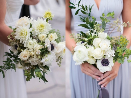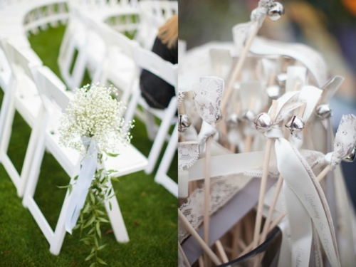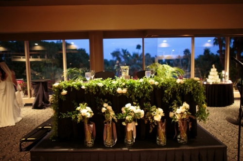 “I wanted a simple thrown-together wild flower look with a little white and a lot of green. For the bouquets, we had long stems and ribbons hanging to match the girls dresses and mine. I let the florist work with what was in season and she did a wonderful job. It was exciting to see what she came up with the day of the wedding. We matched the centerpieces with the same asymmetrical flower look. For the reception, thick draping leafy garland with scattered white flowers decorated the head table. For the ceremony we used bundles of baby’s breath tied to the end chairs with a ribbon and green vines hanging. I couldn’t be happier with our florist. She knew what I liked and went with it.”