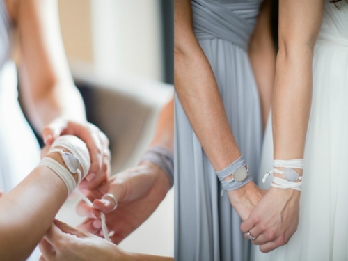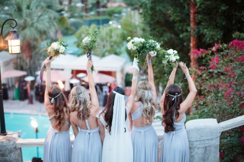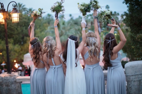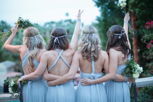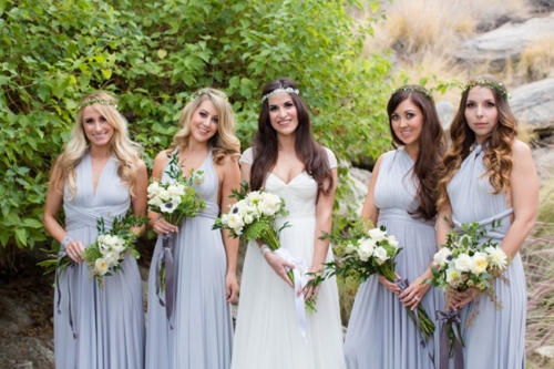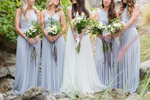 “Simple and light. I wanted the girls to be in light silver from the start. When I found the TwoBirds infinity gowns on sale on Gilt I snatched 4 of them up as quick as I could. My girls were all beautiful (inside and out) and I knew the dress would be flattering on them. I like the wrapped Grecian look with the light color. They looked like Greek goddeses!