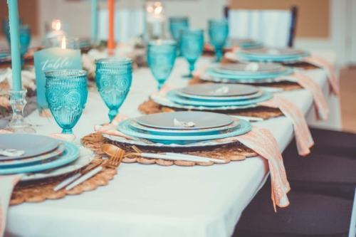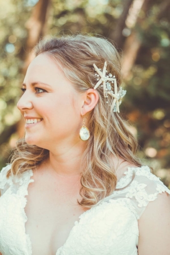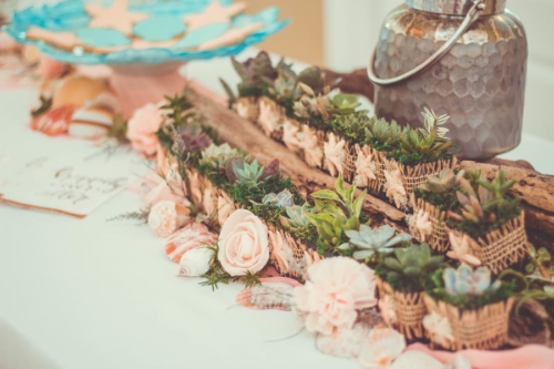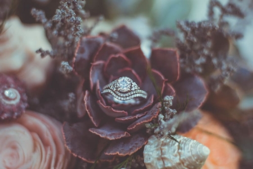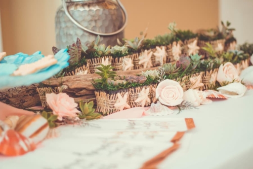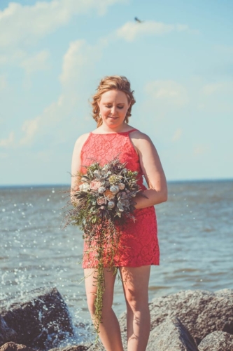 Photographer’s Comments: “I am so excited to share with you our little mermaid inspired wedding shoot! “Our goal was to bring in beautiful colors & romance to a traditional disney love story. This bright and elegant combination was created using golds, teals, pinks, grey & coral to interlace this unique inspirational event. A few of our inspirational elements include the ocean, waves crashing against rocks, succulents to represent the under the sea vibe, & Ariel’s transformation from a mermaid princess to a royal queen. We want to wow brides with the beauty they love & let them know you can create your wedding inspiration from any elements you love without replicating it completely. “I am Krishna Sutherland & I own Krishna Sutherland Photography in Middle Georgia. Creating & designing wedding elements that are meaningful & eye catching is one of my favorite parts of being a wedding photographer. For this styled shoot I was inspired by my love for the little mermaid & obsession for beautiful colors & unique ideas. The Little Mermaid is an iconic movie so many girls fall in love with, from the story line to the fun energy of Ariel’s personality making everyone want to be a mermaid, right?! The disney themed engagements & weddings are everywhere but our team took this vision to another level by looking for cohesive elegant trends within the movie. I adore the love that Ariel has for her Prince Eric who just happens to live in a white castle with a red roof- therefore sparked my idea to host the little mermaid wedding at the stunning Tybee Island Wedding Chapel. I decided I would need a real life couple as my main models & knew just the couple to fit the part. Lauren & Bradley Brooks have been madly in love & got married in September of 2015. Their lasting love always shows when they are together & they share a passion for subadriving. They love the water & Lauren found her perfect Prince in Bradley so I knew they would fill our images with that passion I wanted. I had a strong vision for this style & our team went above & beyond to create this look! “The Tybee Island Wedding Chapel located on Tybee Island Georgia helped create a breathtaking venue any bride would love from the incredible grand ballroom to the famous Chapel that was featured in The Last Song. The chapel was moved after the movie & brought up to island codes adding the ballroom & just a few minutes drive from the beach! If you are looking for a fairy tale dream venue this is a must see! “Since Bradley custom made Laurens engagement & wedding ring designed perfectly for their love story I was honored to use their rings in our shoot. The rings were designed by Steel’s Jewelry in Valdosta Georgia & will surely take any girls breath away. As every marriage is unique I believe the beautiful ring that symbolizes your marriage should be just as unique. “Our amazing wedding gown was a Carrie’s Bridal Collection design style 4187 & can be found at their second storefront, Carries Bridal Collection in Macon. Their other location is in Atlanta. If you are looking for your princess dress they are a must visit with all their pieces design by Carrie herself. They cater exclusively to brides carrying only bridal designed gowns without costing thousands of dollars. “Our table & chairs were provided by the venue & I hand cut chiffon fabric for our chair sashes which helped us depict a beautiful setting under the chandelier filled ballroom. We felt this area brought the most to our layout with a truly royal ambience. Infinitely Elegant Designs crafts stunning woodwork & supplied our coastal Bride & Groom chair signs. Dee with Willow Gardens traveled from Florida and designed an amazing succulent table spread. Echeverias, mixed succulents with strings of bananas & strings of pearls were used in the design on the tables as well as our bouquet & boutonniere. You can find the beautiful eco friendly sola flowers throughout her creations which she customizes the color for each event. Willow Gardens specialized in succulent wedding designs & is fabulous to work with. Alongside the greenery & succulents is a handmade oyster shell garland created by Vintage Rain to drape our tabletop over a grey chiffon runner. This unique piece is not easily found & extremely time consuming. We love the beauty the pearly oysters bring to our vision blending royalty with our under the sea princess inspiration. The tabletop place settings are through our favorite vintage, china & glassware rentals provided by The Prissy Plate Company in Atlanta. Their collection of colored goblets, mismatch of china, and napkins brought our style to the next level with the beautiful colors & classic touch. To assure we had the romantic feel to our style we added assorted glass candle holders with floating candles & taper candles throughout our setup. Our dazzling sea glass table numbers by My Letters From Eden add luxuriory & the perfect pop of color to our setup. “J. Graham Lettering composed gorgeous oyster shell place cards & we just do not know how he does it, but the calligraphy on each shell is beyond perfect. They are definitely a must have for any coastal wedding event! “Our ocean inspired three tier cake designed by Make It Cake in Middle Georgia was beautifully crafted & the perfect addition to our shoot. From the delicate swirling colors to the lovely isomalt sculpture that coast down the tiers convey the crashing waves we see as Ariel watches Eric on her iconic rocks. “Our favors table features our birchwood anchor guestbook another gorgeous product from Infinitely Elegant Designs. They custom made this engraved anchor for the shoot & we know brides will love this alternative guestbook to display in their home. Another beautiful sea glass sign by My Letters From Eden & gold sea inspired toast glasses by The Prissy Plate Company. P.S. Sweets bakes incredible creations with her cookies. We are in love with her delicious elegant starfish & seashell