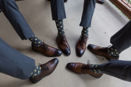 Stylish matching socks and shoes for the groomsmen always makes for a fun photo op. Although, I have to say that I would love to see the groom in a different color one. I think it makes for an instant contrast and easily identifiable groom. But, whatever makes you happy on your day. That’s what matters most