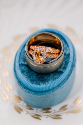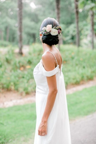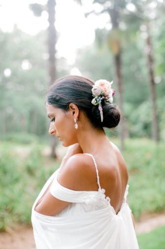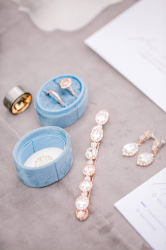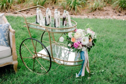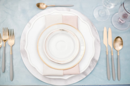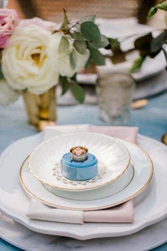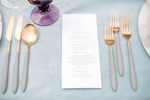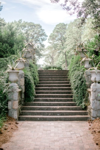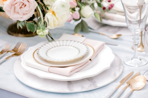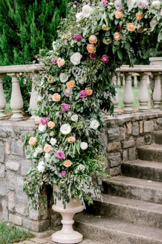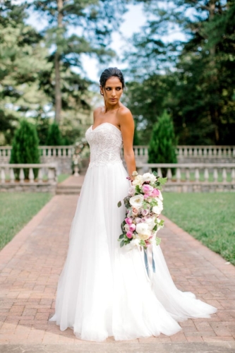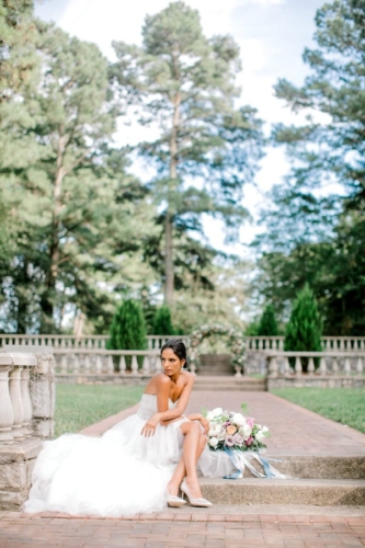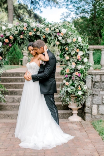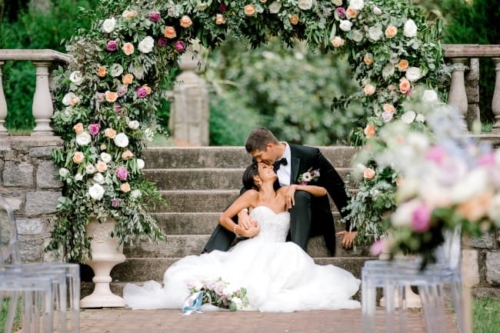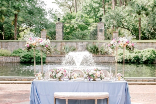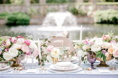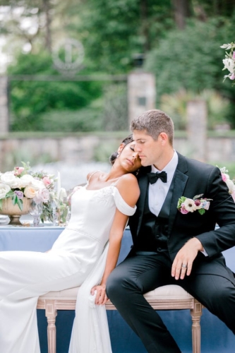 Narrative written by Kamesha Richard, Ava Loren Design: “When developing the aesthetic for this editorial, the union of timeless elegance with a touch of relevant modernity was the foremost intention; the abiding appreciation for both Old World elegance and modern refinement. The setting of the Renaissance Court of The Norfolk Botanical Garden provided the epitome of the steadfast beauty synonymous with 16th Century Italian Renaissance gardens and quickly became an undeniable choice for the location. A blend of bespoke design and floral elements and the stately essence of this location combined for an idyllic backdrop to showcase the illuminating love of a real-life couple. Grand focal points were a must for the Ceremony and Reception Scenes to honor the stately presence of the Garden’s design and its fountains, statues and balustrades.To define the Ceremony setting, an elongated floral arch brimming with lush Foliage and Garden Roses was created in two stone urns to frame the couple and became an enchanting setting for their tender embraces and romantic radiance. The selection of acrylic Louis XIV chairs was a deliberate choice for the least visually unobtrusive seating to maintain the sightline of the scene while introducing a contemporary finish into the classic setting. Continuing the idea of defined focal points, the Reception setting was framed by Italian Cypress evergreens and limestone fountain statues. The dining table styling was a curation of contemporary and heirloom selections. Marble chargers, gold accented vintage china and two-toned sleek flatware displayed on layered pale blue and lavender hued linens alongside bountiful floral arrangements made for a sumptuous look with swells of visual interest. Anchored in layers and layers of shimmering oyster hued tulle, the Bride dazzled in a statement Justin Alexander gown featuring a jewel and pearl encrusted bodice; combining both an airy whimsy of subtle pattern and texture and elegant form-defining style. The Reception look was a chic, high fashion take on the traditional cathedral train with flows of billowy crepe on a sleek trumpet bodice and skirt. The Maggie Sottero gown featured delicate straps, embellished with lace appliqués and crystals, with elegant “off the shoulder” caps in tasteful grace. Each gown was perfectly complemented with a bountiful bouquet featuring fresh Garden roses and scented geranium and embellished footwear from Badgley Mischka. The groom’s black tailored tux, dapper bow tie and sleek footwear made for a refined, timeless look. In addition to his classic styling, his floral pocket square showcased a distinguished finishing touch to his ensemble. A timeless Renaissance-inspired garden setting and the intentional melding of timeless sophistication and modern style was the outcome of a selfless collaboration of talented professionals and defined the realization of this exquisite editorial.Gallery