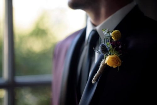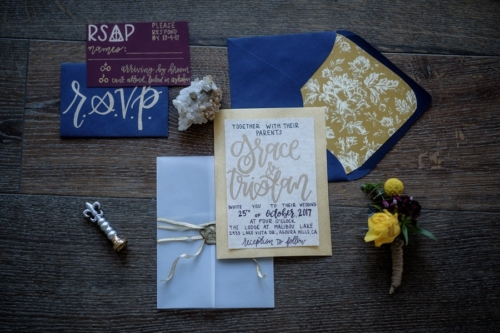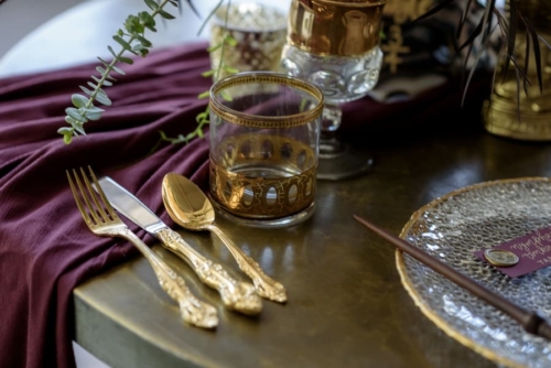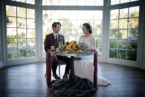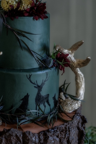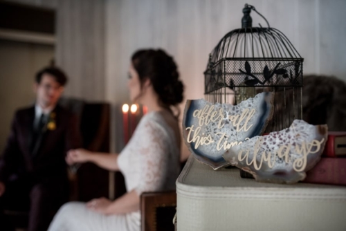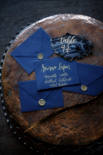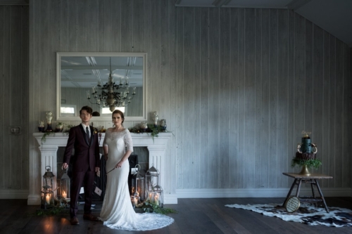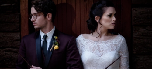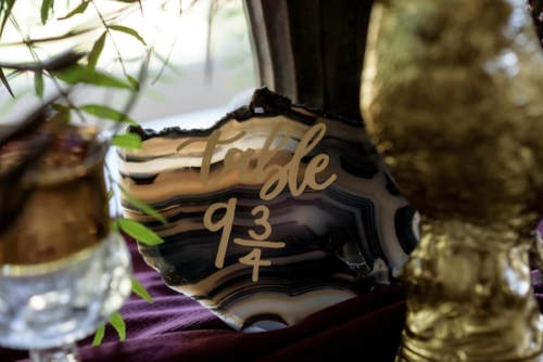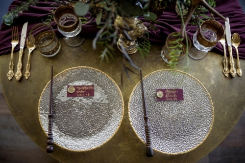 Vendor Remarks: “This styled shoot was a collaboration between a bunch of Harry Potter loving vendors and one very dedicated coordinator who hadn’t read a single book or seen the movies. “The woodland colors and motifs were inspired by the Marauders Era of Harry’s father James Potter and his best friends growing up in the 70s in the UK. We wanted to hint at subtle homages to this fandom rather than an outright theme. “We used antlers to represent James, as his nickname is Prongs, hand carved wands as table settings, Hogwarts letters around the fire, antique furniture, and even an incredible rustic spread of food to represent the Hogwarts feast. “The stunning lace dress had a vintage feel that we though looked perfect on our witch bride, and the jewel toned burgundy suit would be any dapper wizard’s dream. “Though this late October day was a sunny 105 degrees, we used shade and lighting to achieve the cool overcast atmosphere that reminded us of London. “Our incredible stylist was cutting our groom’s hair on site, giving him a stylish do, and once we placed the round iconic glasses on his nose, we told him he wasn’t allowed to take them off. Our bride looked perfect with forest green eye shadow and as stunning braided updo, and together the couple looked the very picture of a stylish wizard family.”Gallery