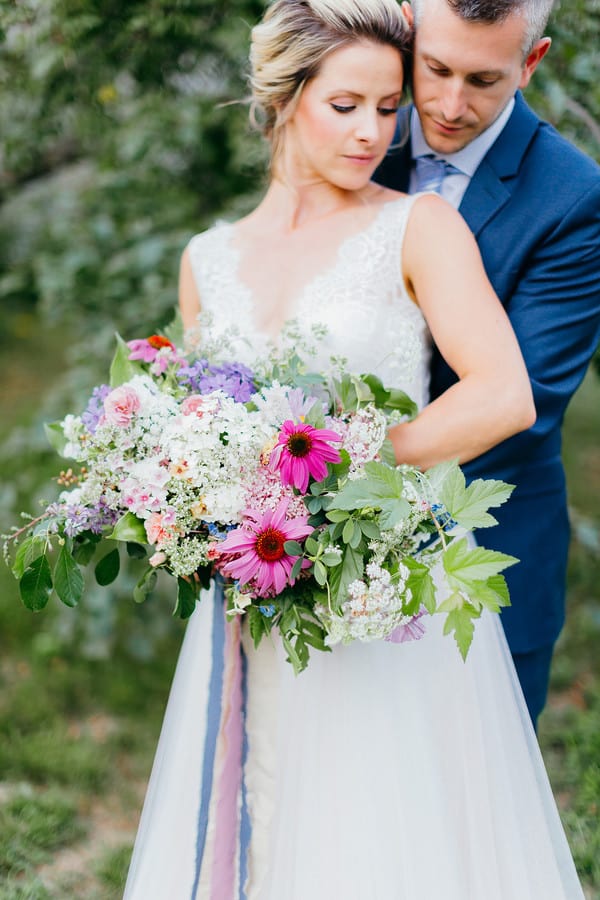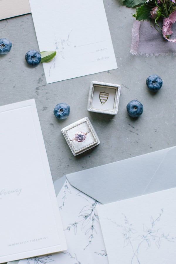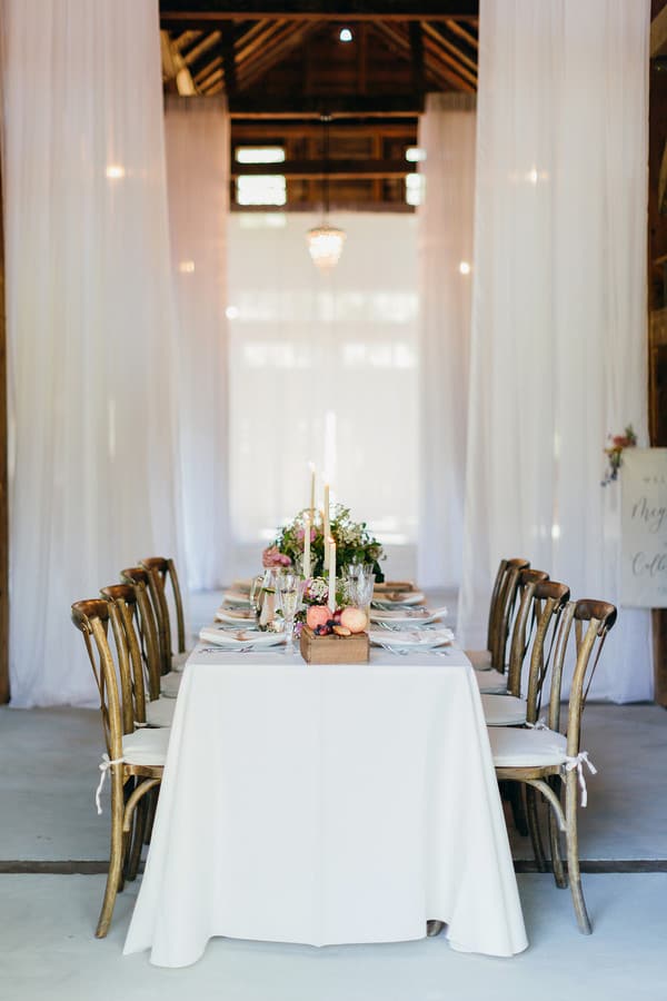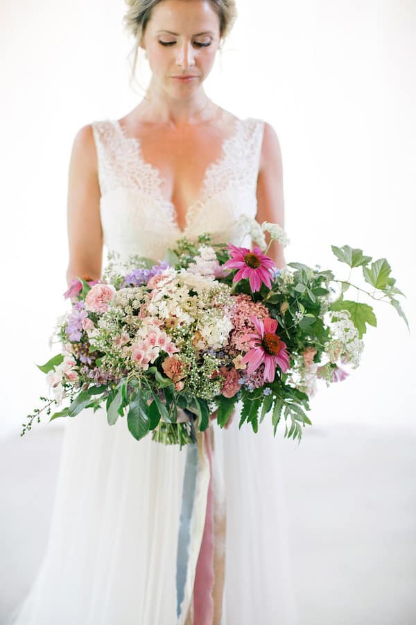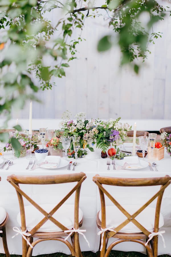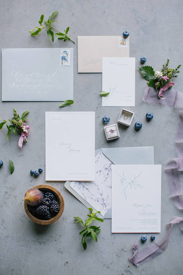Photographer Comments: “The harvest season in Maine is short, but so so sweet! This fun time when couples are caught picking at family farms, inspired this shoot. From all the different berries, to fresh herbs, and veggies, there’s a lot to harvest in this coastal state. Everything was designed with this in mind, bring a coastal Maine experience to the day. The venue is a barn with a lot of beautiful land overlooking a stream with plenty of sweet apple trees! From locally sourced fruits filling the tablescape, to the floral, the dessert spread, and the stationery design, harvest season flourishes throughout this day. The floral design pulls in unripe berries while using soft and bright summer shades reminding us of the summer season. It’s carried on the table and paired with lots of fresh fruits, delicious champagne sprinkled with herbs. The menu was planned with a Maine experience in mind; lobsters, mussels, goat cheese! The dessert carried the theme and was a delicious spread of options for anyone with a sweet tooth.”Gallery