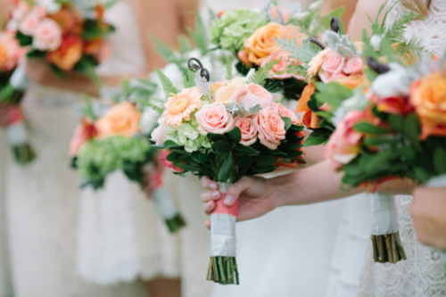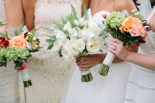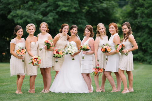“Our flowers were done by Kittelberger Florist in Webster, NY. My bouquet had garden roses, lilies, dusty miller, seeded eucalyptus, hydrangea, and ferns. The bridesmaids and other flowers were similar but in a variety of light pinks, oranges, corals and greens.” Describe the Bridesmaids’ Attire