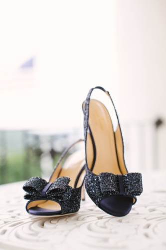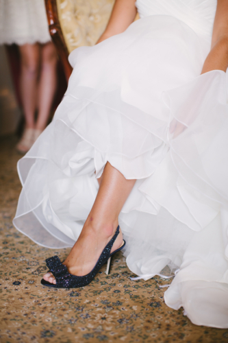 “My dress was a fairly traditional organza ball gown. My shoes were my something blue – fantastic navy sparkly Kate Spade peep toes.”