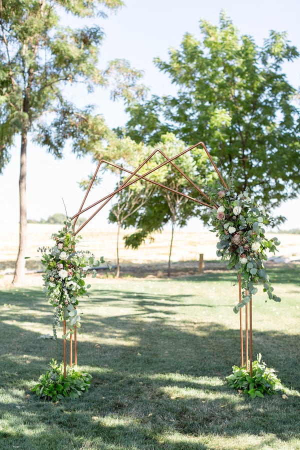 A2: The ceremony space was very simple. We had eucalyptus on the aisle chairs all the way up the aisle. Our arch way a DIY amazing piece that was some what of a geometrical shape that was decorated insanely beautiful by our florist. We had 2 amazing flower pots at the beginning of the aisle on both sides. For the entrance we had a DIY welcome sign that was white and black very simple but beautiful. Our guestbook table had hints of our beautiful rose gold centerpieces on it. The reception: We had hexagonal terrariums that were rose gold as our center pieces. They had succulents in the center of them. They were all DIY. We had DIY charcoal gray jars that our florist filled with stunning flowers. The cocktail tables had a very cute special touch. The table cloths were pulled together around the stand of the tables and held with a glittery rose gold piece of fabric. Our dessert table had a very similar set up with a special stand that was a hexagon shape to display the churros.