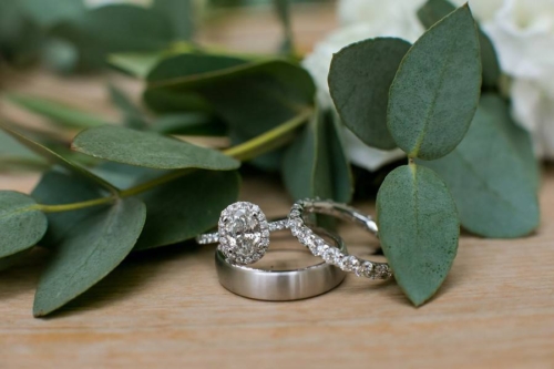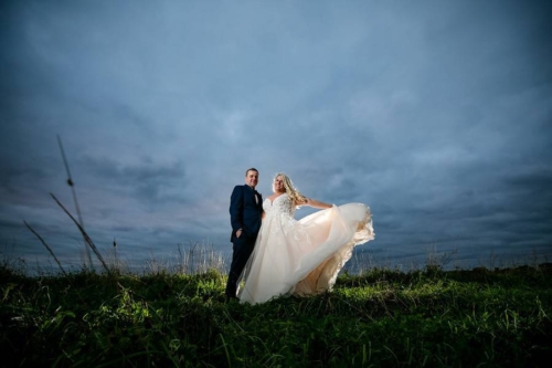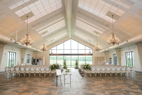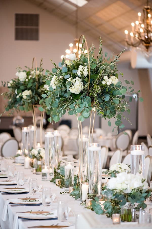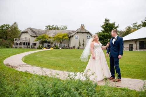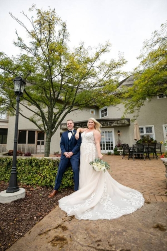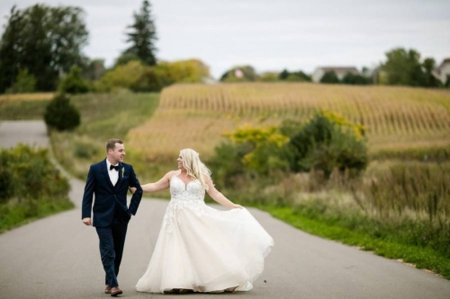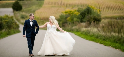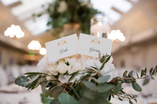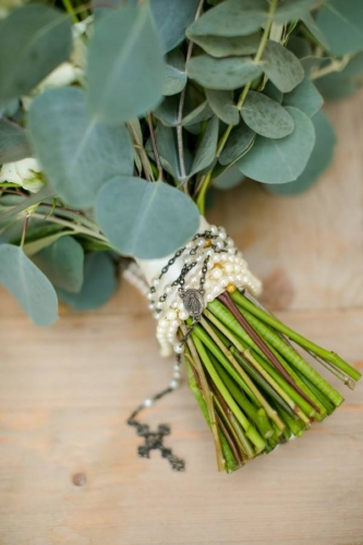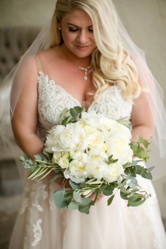 Photographer’s Comments: “Mary and Ben got married at Bavaria Downs!!! These two got engaged on Christmas day and have been busy wedding planning since! The big day was full of personal, unique touches like Mary’s grandma’s rosary and her other grandma’s pearls wrapped around her bouquet, Mary wore her mother’s diamond earrings, and a cousin officiated the ceremony! The only family members missing were the couple’s fur babies- Bosco and Bear the Chihuahua! To match their classic and charming venue, the couple’s floral included white blooms surrounded by greenery.”