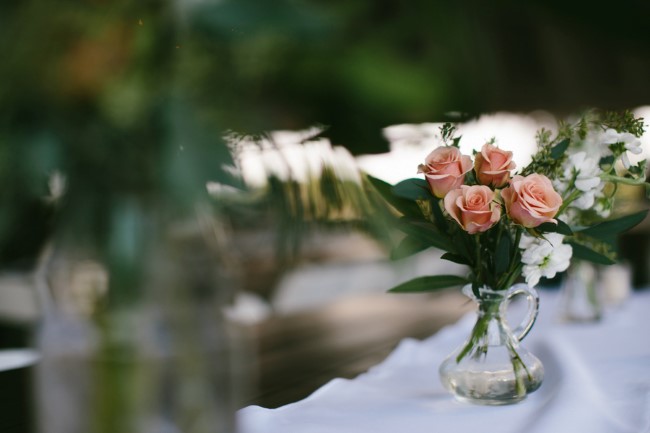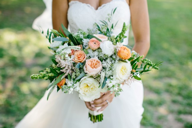 Gorgeous three-tier wedding cake that seamlessly blends the floral decor into the rustic vibe. Love how the foliage and flowers trail down and connect each tier. And that white platter is simply perfect – not overbearing and presents the cake nicely!