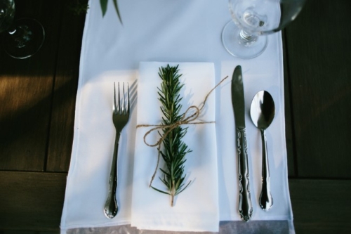 - A simple yet effective look that anyone can DIY for a table setting: napkin + twine + sprig of rosemary. Set against the crisp white linen and dark wood table, we think this rustic look is achievable for any budget conscious couple.