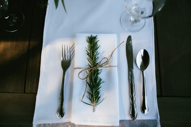 A simple yet effective look that anyone can DIY for a table setting: napkin + twine + sprig of rosemary. Set against the crisp white linen and dark wood table, we think this rustic look is achievable for any budget conscious couple.