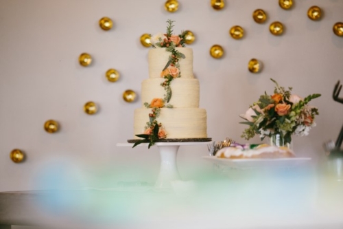 - Gorgeous three-tier wedding cake that seamlessly blends the floral decor into the rustic vibe. Love how the foliage and flowers trail down and connect each tier. And that white platter is simply perfect – not overbearing and presents the cake nicely!