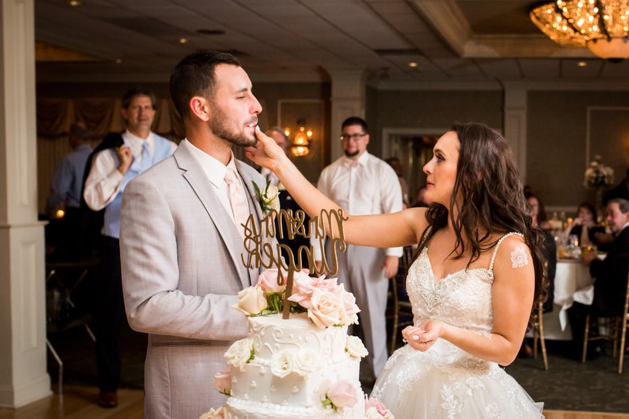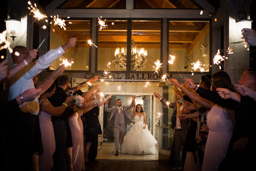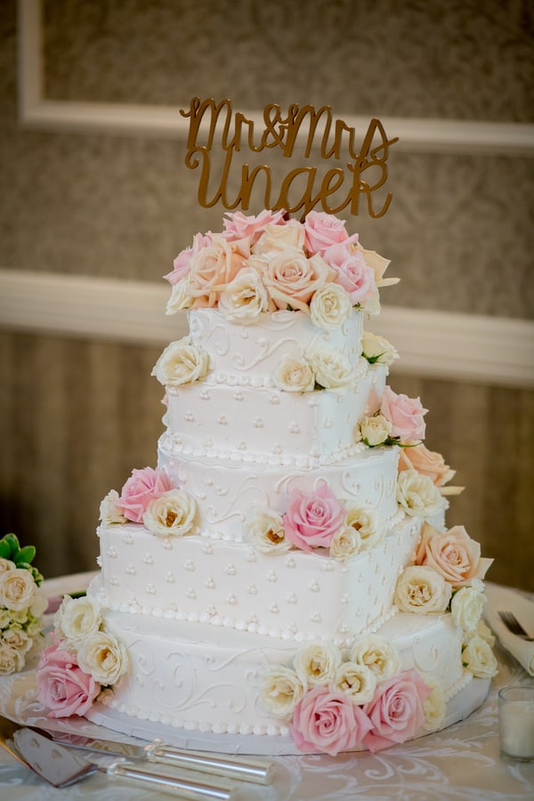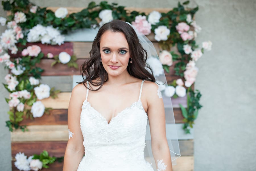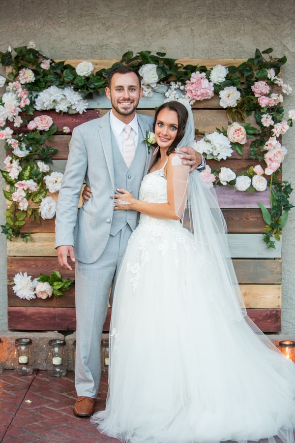 Q1: Tell us about your wedding!“My husband’s biological half-brother is a pastor and officiated our wedding.I wanted to incorporate little personal touches. My husband is covered in tattoos, so instead of a photo booth, we made a temporary tattoo station. A close childhood friend who tattoos for a living played temporary tattoo artist for the day. The tattoos were a huge hit for kids and adults alike.I love Beyonce and a good dance party, so to honor Queen Bey I asked my bride tribe to learn some choreography to surprise our wedding guests with and bought them each an iconic black wide-brim hat.”Q2: Let’s talk wedding decor“My husband and I are both in the Construction business, and art is a beloved hobby of mine. To add a personal touch to the ceremony, I had my husband break down, chop up, and put back together a palate for me so my bride tribe and I could paint it and adorn it with flowers. It turned out beautifully and made a great back drop for pictures.”Q3: What were the florals like in your wedding?“Peonies are my favorite (I’m cursed with expensive taste). Unfortunately they aren’t quite in season in August, so I settled for some classic roses for my bouquet and ceremony back drop, with a few fake peonies included.”Q4: What were some of your favorite parts of your wedding?“My sister has a beautiful voice. She sand and played a few songs on the piano for our cocktail hour.The band was spectacular. My family loves a good dance party, and the dance floor was packed the whole night.”Q5: Let’s talk fashion“I went with a backless A-line spaghetti-strap tulle wedding gown with beautiful beading. My husband wore a light grey tux, pink tie, and grey vest.”Q6: How did you meet?“We met working at a local restaurant. He proposed after a year of dating during a vacation to Yosemite National Park where I met his mom’s side of the family for the first time.”Q7: What was the most anticipated or special moment of your wedding day?“The first look was so exciting.”Gallery
