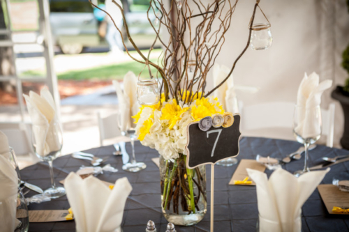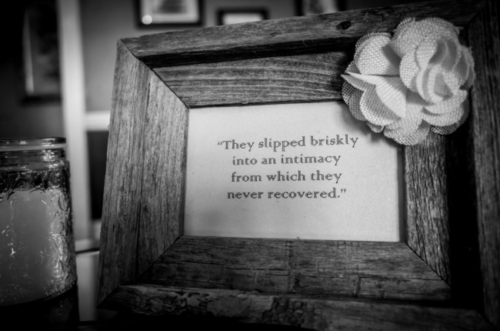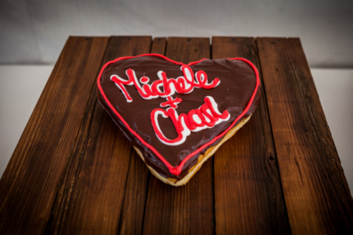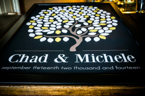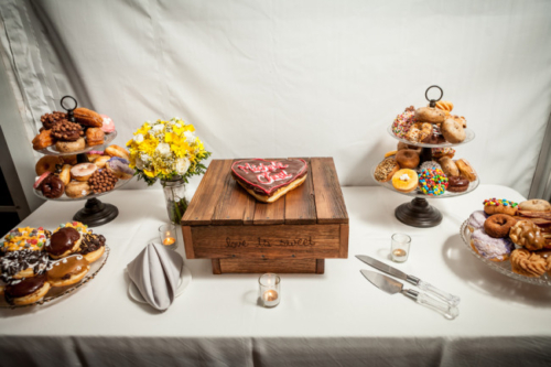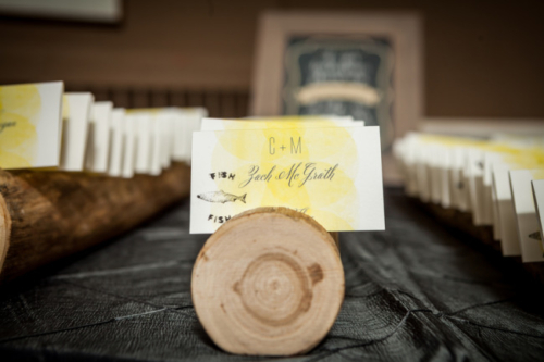 “Chad is an arborist, so it was important to us to include elements of nature within our decor. Chad cut several discs of wood to use in our centerpieces. We also used tree branches (created by a friend’s father) to hold the escort cards. We used a beautiful wood-burned pallet to display the donuts that we chose instead of cake. Â I am a lover of literature, so we had my favorite quotes in wooden frames placed throughout the reception. As a favor, I baked cookies from a recipe of my late grandmother’s. We left them at every seat and I know it was a touch that my family members appreciated.”
