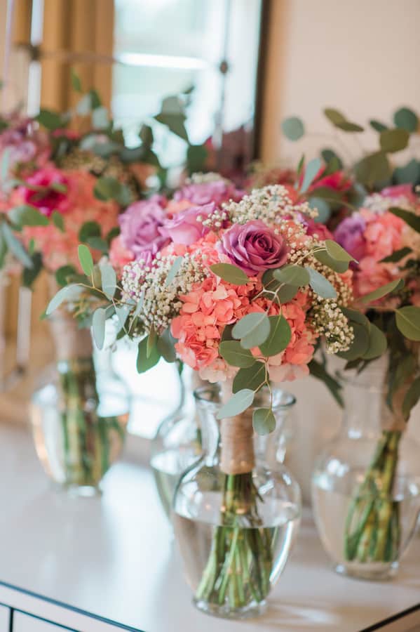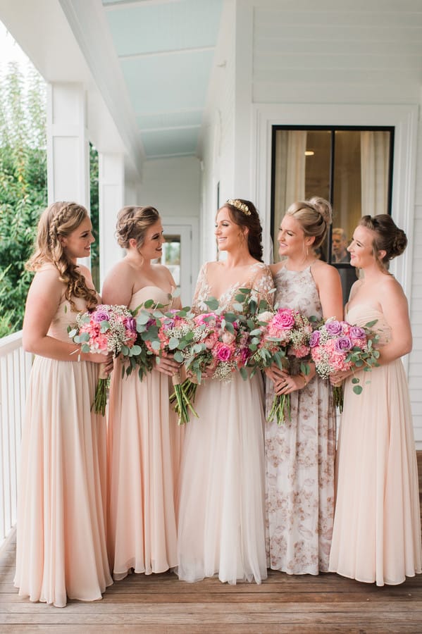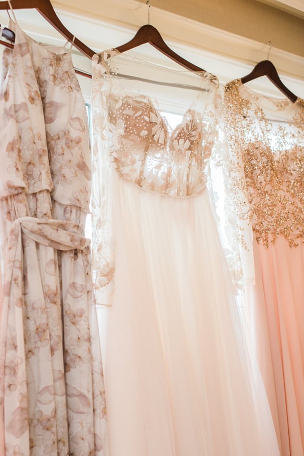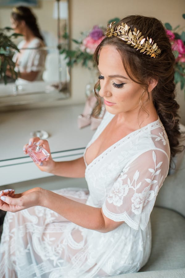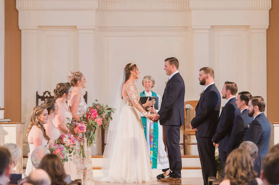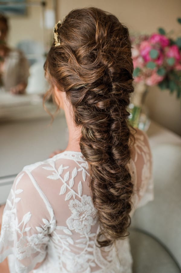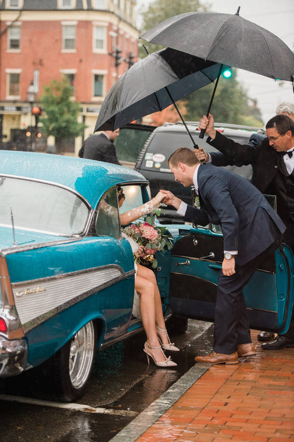 Bride’s Comments: “Portsmouth, New Hampshire has a special place in my heart. I grew up in the area, I opened my boutique, Pretty Little Things there, and my fiancé, Patrick and I fell in love there. It is the perfect mixture of small town with big city feel. I knew it would be where I wanted to get married. “I wanted our wedding to be a mixture of rustic Portsmouth charm and high fashion details. Owning a boutique and working in the fashion industry I knew aesthetic was going to be important for my wedding. I almost instinctively viewed it as a fashion photo shoot. “When I tried on the Remmington Gown by Hayley Paige with its gorgeous tulle and floral embroidery it felt like the perfect choice to fit in with the rustic feel that our reception at Mombo Restaurant had. I then added the Anna Marguerite Crown, Kate Spade Lydia Heels, and cathedral length veil as high fashion details. “My wedding florals by Wanderbird Floral were all based off the colors and pattern in the Alana Dress by Donna Morgan which my maid of honor wore. Every detail was worked into a cohesive overall look. “So as they say you can plan everything but of course you can’t control the weather. The night before it started raining hard and lasted the entire day. I had worried about this the whole week leading up and it was funny because it just didn’t seem to matter the day of. My maid of honor had joked she was expecting a complete bridal meltdown and was shocked to find me in good spirit sipping on prosecco as Wink Salon and JoLouise Beauty worked on hair and makeup. “I was so excited to be marrying the love of my life and overwhelmed with love and support from friends and family that everything just seemed to work out. “Getting ready at the Wentworth By The Sea Hotel, I made a last minute decision to change my hair to that amazing Daenerys Targaryen braid to weatherproof it. As I placed the crown on my head, I couldn’t help but feel like princess.T “he ceremony itself was such a blur of excitement and anticipation. I don’t remember much other than holding hands with Patrick and smiling. I swear it was over so fast and then Patrick and I were off just the two of us holding hands running through the rain to the 1957 Chevy Belair. “We switched our photography plan because of the rain to inside our ceremony location at the South Church. The light was perfect and I couldn’t of been happier with the stairwell shots of Patrick and I. Sometimes the most mundane places like a stairwell of a church can become so beautiful. “We did manage to get a couple of shots of us in Prescott Park, which was the original plan! Casey Durgin, our photographer was brave to put herself out into the pouring rain to get the shot. I even venture to say the rain made our day more unique and special. “Also, apparently it is good luck. Sometimes the unplanned can be even more beautiful than the planned. Our night concluded with so much dancing under the twinkling lights at Mombo Restaurant that I destroyed my Kate Spade shoes, but I couldn’t of been happier. “Surrounded with all the important people in my life I celebrated the beginning of a new life with Patrick.”