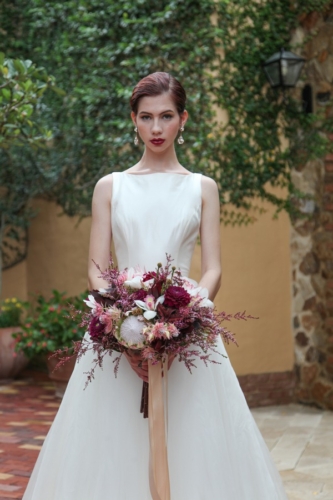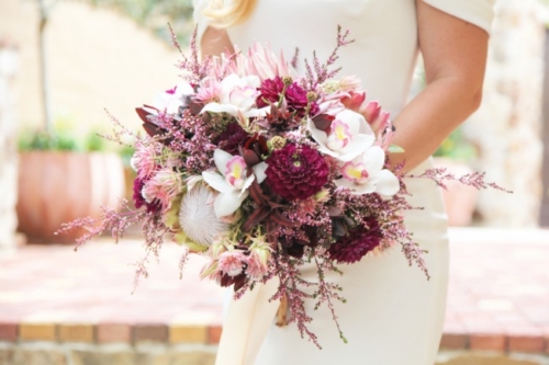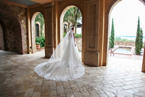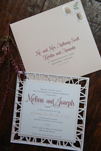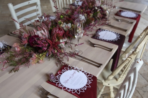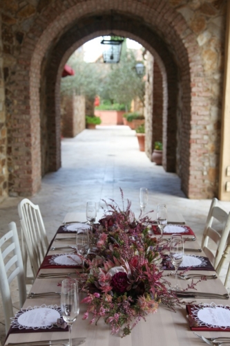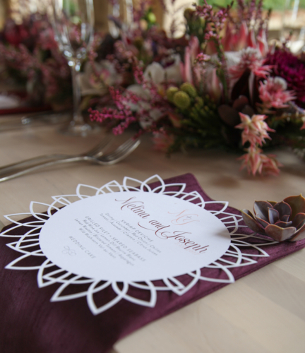 Gorgeous burgundy color floral arrangements and table styling elements combine to form a naturally palette that fits right into the Italian style venue. Beautiful laser-cut wedding paper designs infuse a bit of fun into the day. Enjoy!