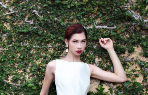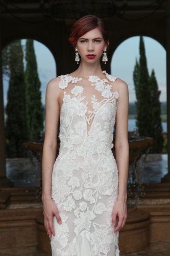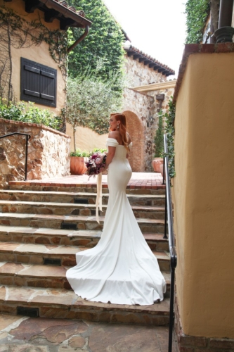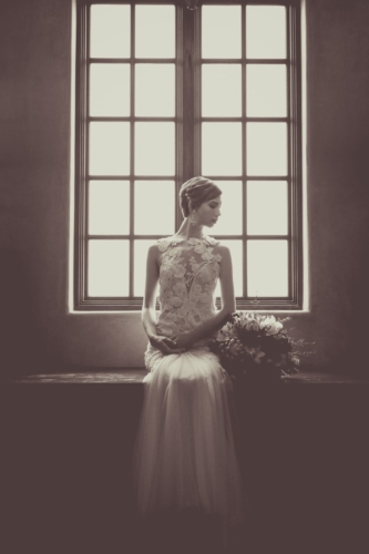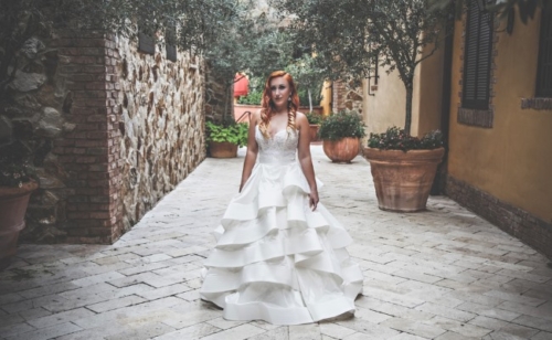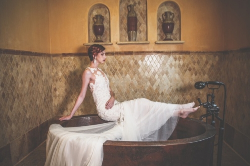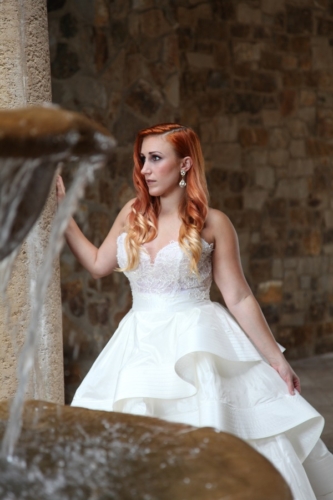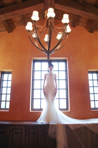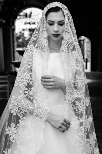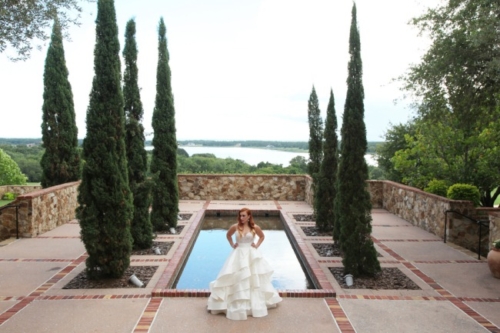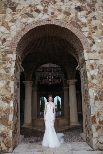 Stone walls and high Cyprus trees frame a backdrop of glamour for the two gorgeous models to showcase modern wedding dress ideas.