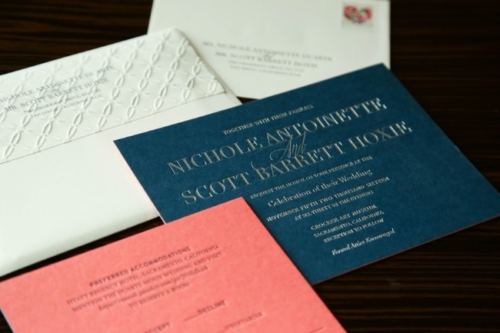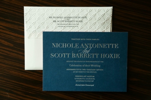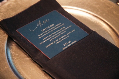 We’re big fans of chic and simple stationery suites like the one above. Dark blue invites with silver text, salmon pink RSVP, and textured white envelopes create an eye-catching and tactile introduction to this art museum wedding. Plus, check out the matching dark blue menu card further down in this post!