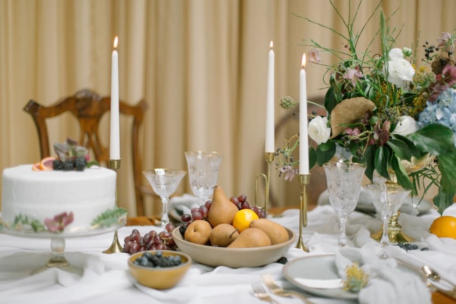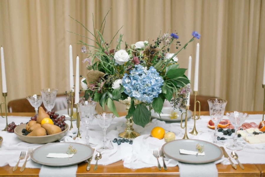 Photographer’s Remarks: “This film-inspired digital styled shoot was inspired greatly by the beauty and elegance of the Dutch Golden age around the 16th century. We incorporated paintings from the famous Dutch artist, Vermeer, in the invitations. “We also set the beautiful candle-lit table to replicate that of an old world opulent feast. Our stunning bride was a sight to behold in her bloom-laced, deep v-bodice gown with a train fit for royalty. “In this bridal styled shoot, we wanted to showcase the fine art, romance, and richness from that era in a modern day bride.”