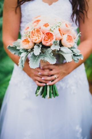 “For the bridesmaids bouquet we had baby’s breath and the bridal bouquet was peach colored garden roses and baby’s breath with dusty miller around the outside, the center pieces were white stock, and downs the aisles we had baby’s breath.”