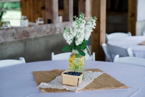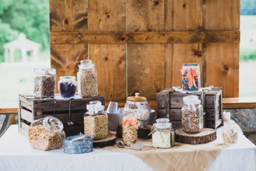 “For the wedding favors we had a trail mix bar with jars of different kinds of nuts and candies with baggies people could put it in. We purchased everything at the grocery store. For our guest book, we bought a burlap journal from Hobby Lobby.”