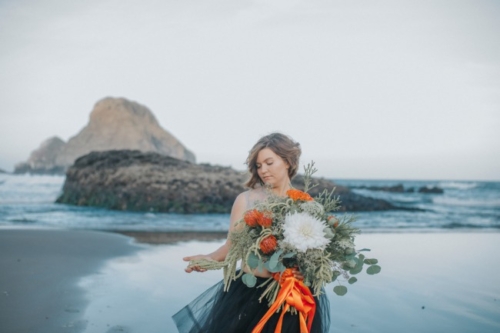 “We captured this stylized shoot that I am officially calling “Eclipse Bride.” Located on the Oregon Coast we are blessed to have incredible rocky shorelines that expose incredible creatures including orange and purple starfish, anemones, crabs and mussels all of which inspired this stylized shoot.