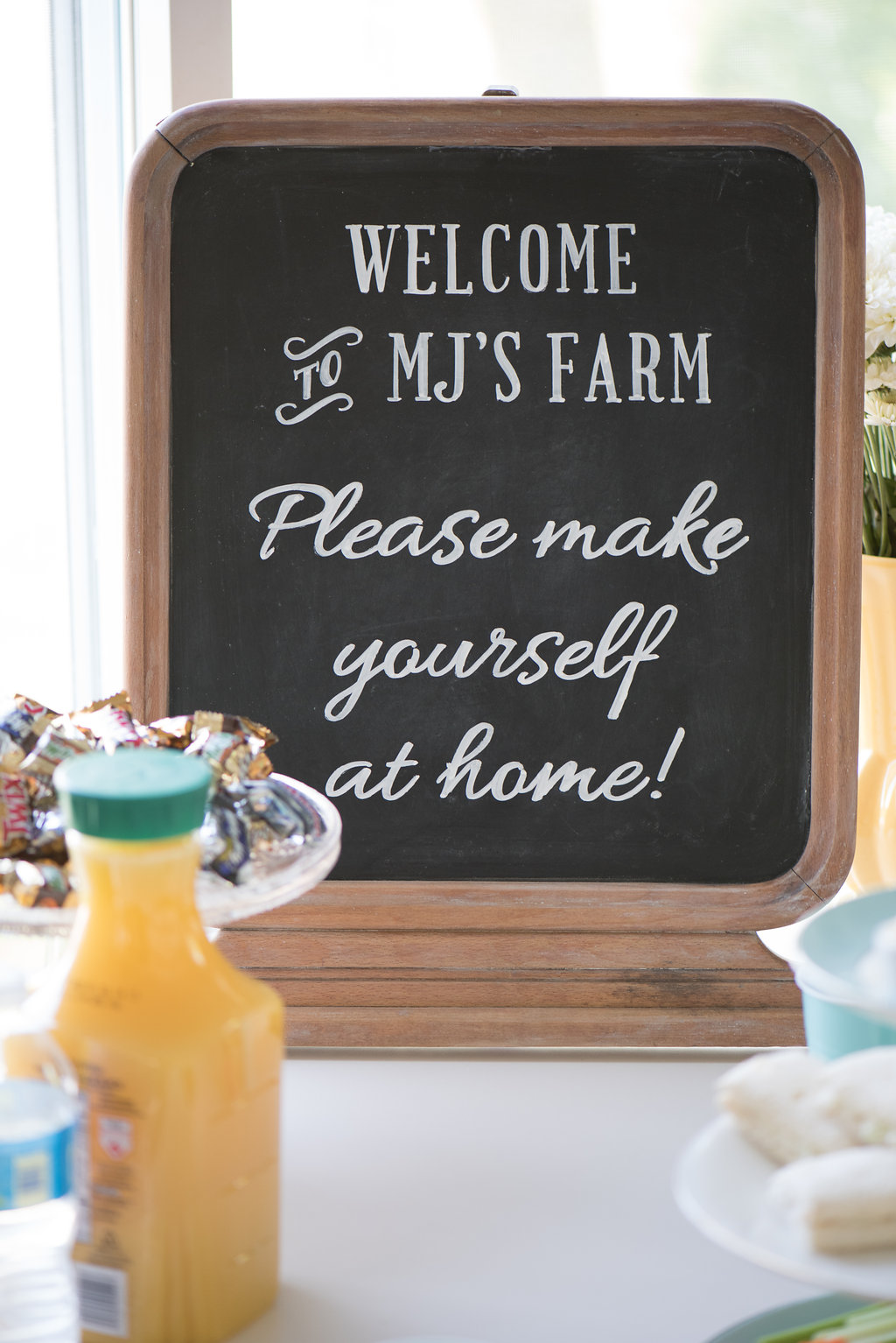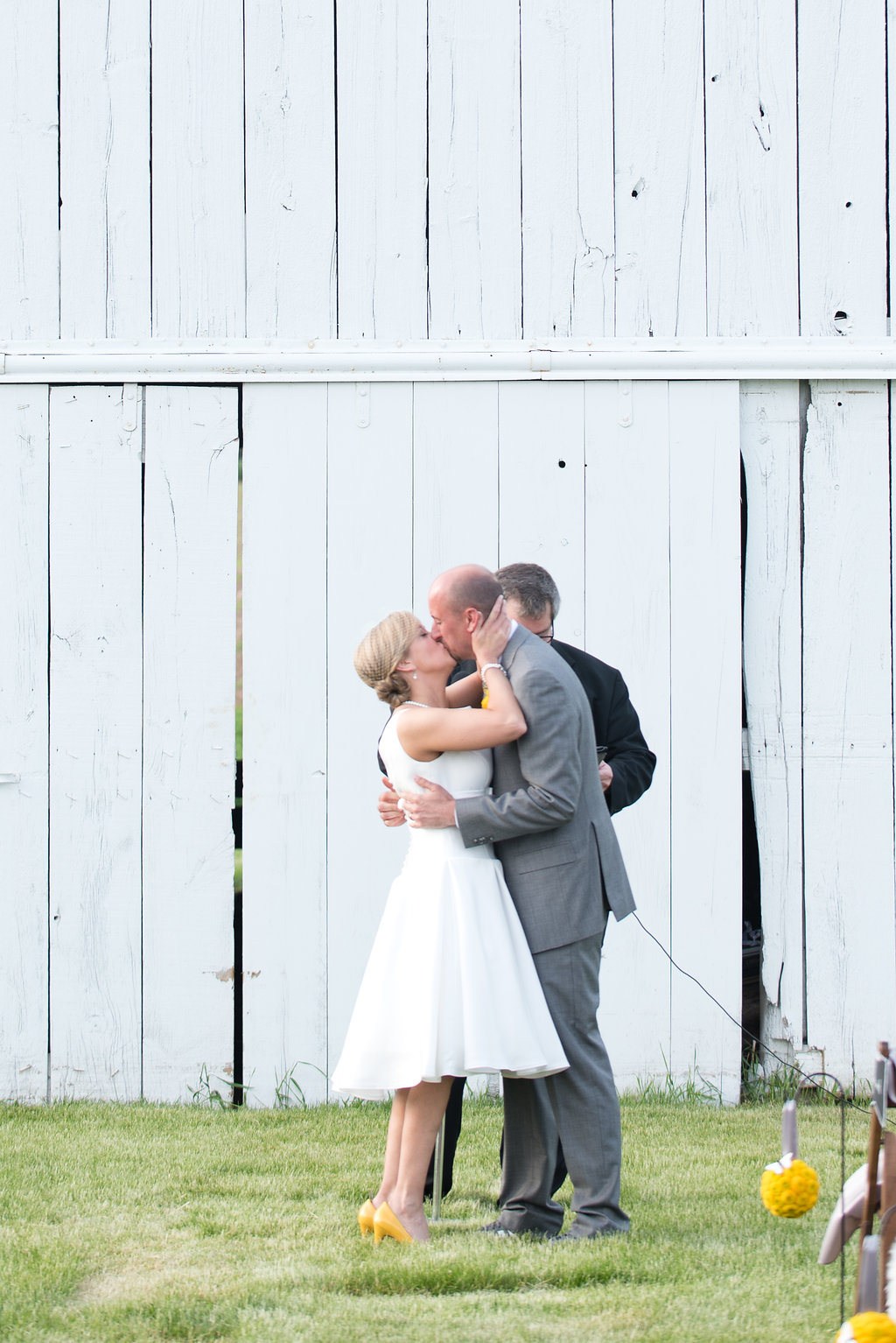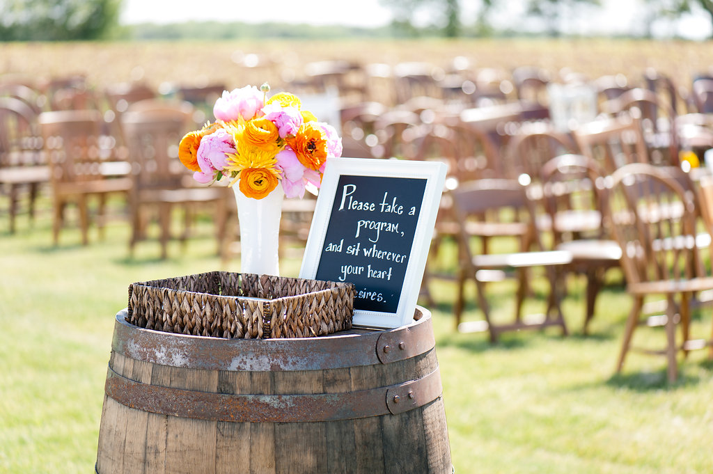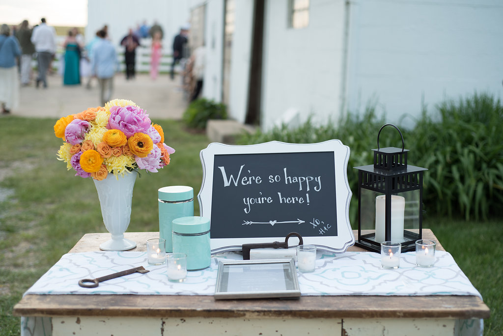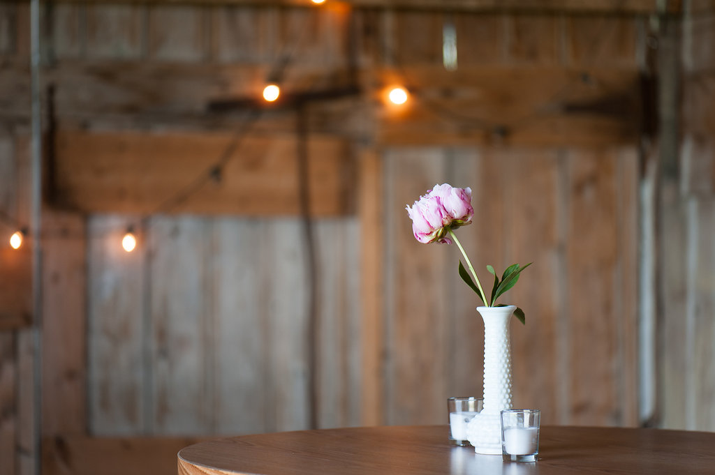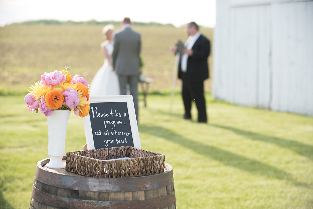 Comments from the bride: “The look was modern-vintage.  Being on a farm reminded us both of our grandparents, so we chose things like vintage white milk glass bud vases, Fire King milk glass coffee mugs, metal coffee urns, and peonies.  We have a modern aesthetic in our home with simple clean patterns and crisp, cool greys with pops of yellow, orange and turquoise.  This drove our choice for the color palette – modern table runners, yellow billy balls, orange ranunculus flowers, and a clean simplicity to the overall design.”