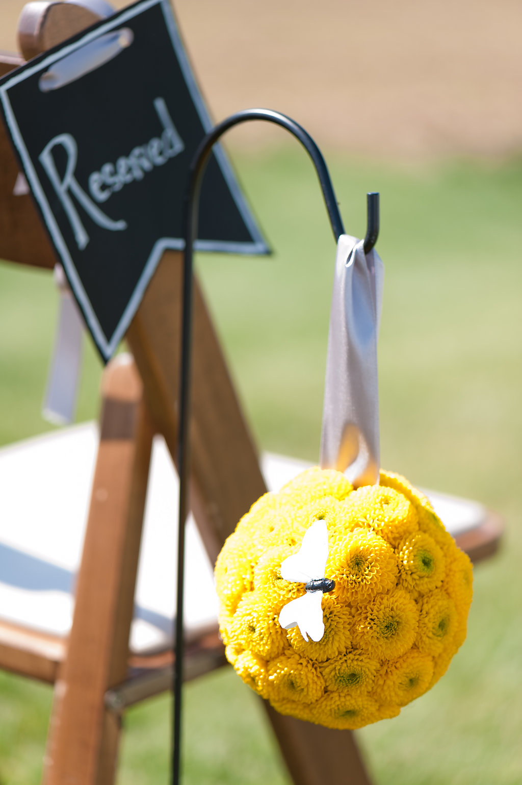 “Our talented friends, Keely and Marcy of Mayfield Flowers, helped us create our Modern-Vintage theme.  Dinner tables featured all yellow billy balls, football mums and spider mums in white milk glass bud vases.  My bouquet sat in a vase on the head table, along with pomander balls made of yellow mums re-purposed from our ceremony aisle. “My Dad’s wedding band was tied to my bridal bouquet, which was made of bright pink peonies (representing the home my Dad grew up in), orange and yellow ranunculus, yellow garden roses (representing Friendship), yellow football mums and yellow billy balls.  Corsages and boutonnieres were made of yellow billy balls, yellow button mums and yellow ranunculus.  Inside the barn, the girls created turquoise wooden boxes with blocks of color using all of the flowers above.  It was beautiful, colorful, clean, simple and fun.”
